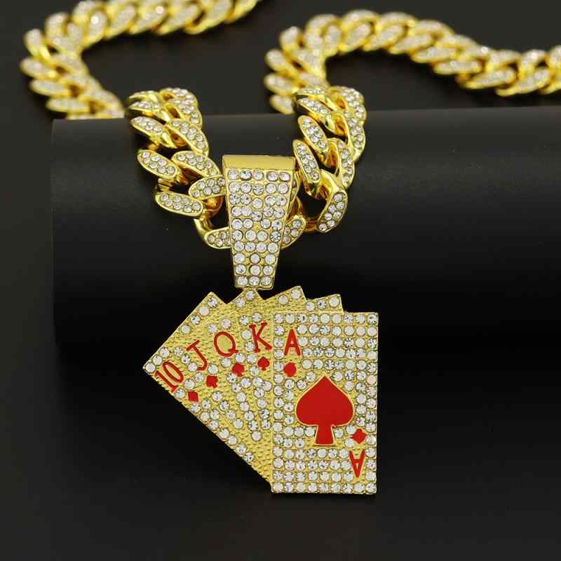 ネックレス メンズ ヒップホップ ストリート系 エナメル トランプ ポーカー ペンダント 大ぶり ジルコニア ラインストーン キューバンチェーン ゴールド 喜平チェーン