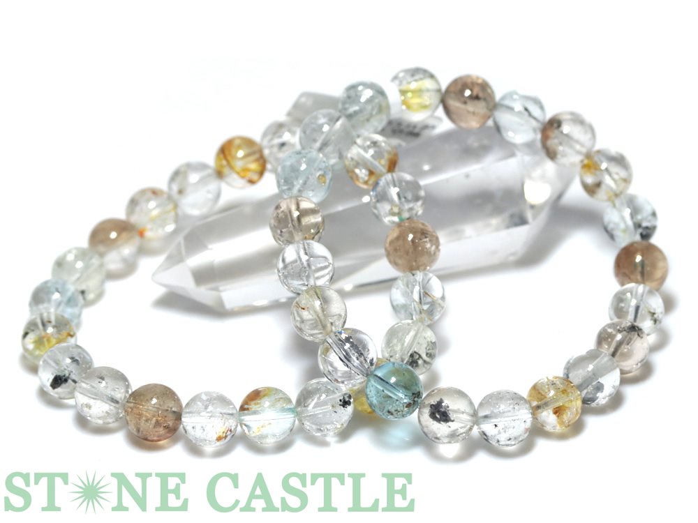 【特徴】今回入荷したインクルージョントパーズは一部ブルーに発色した珠もありますが、その殆どがナチュラルカラーのトパーズです。放射線処理を施す前の無色透明が流通する事は意外と少なく、見る機会も少ないのではないでしょうか。その限られた無色透明なトパーズ中でも、とても個性的で希少性が高いとされるのが透明度の高いクリアなトパーズの中に、細かな内包物が閉じ込められた総称して『インクルージョントパーズ』です。そして一個一個に様々な別の鉱物が閉じ込められており、オンリーワンの希少さをより引き立てています。その種類は様々で、多種多様な見応えがまた面白味を感じさせてくれます。【仕様】玉サイズ:約9〜9.5mm玉数:約21玉内径:約15.5cm【パワーストーン】トパーズ:淡青色から黄金色、カラーレスなど幅広い色を持つトパーズ。太陽神の力を秘めており、力強い陽のパワーで緊張をほぐ し、落ち込みを和らげ、高ぶりを鎮めるとされています。ブルーのトパーズは真実を知る力、黄金色は豊かさ、カラーレスはイメージの具現化、全てのカラーに おいて頭脳明晰をもたらすと言われます。ビジネスの成功、受験・試験・面接、眠れない時、考えをすっきりしたい時などのお守りにどうぞ。【原産地】ブラジル【お届けについて】こちらの商品は同じ品質の中からランダムで商品を出荷します。色味等にご希望がありましたらお気軽にお問い合せ下さい。なるべくご希望に近い商品をお選びします。ただいま、レビューを書いていただいたお客様に200円クーポンプレゼント!!