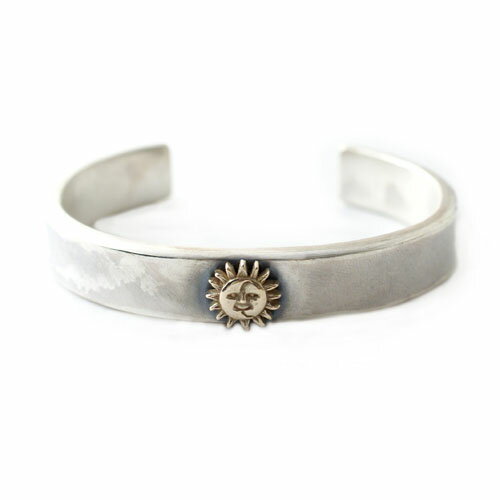 『mollive HeavyOZ(モリーヴ・へヴィーオンス)』シンプルな大人のジュエリー"mollive(モリーヴ)"の、ハードライン。 へヴィーなボリューム感と、オーガニックなシルバーデザイン、こだわりの大人に向けたアクセサリーシリーズです。 月と太陽は光と影を表すモチーフ。 古来よりメキシコでは、月と太陽を一体にしたモチーフは「男性と女性の融合」の意味を持ちます。 人生は光と影。 あなたと私は一心同体。 というような意味を人それぞれに感じ着用出来るデザインです。 メキシカンなテイストで彫り上げたシリーズ。 肉厚の男らしいベースバングルシルバー925にK10ゴールドでモチーフを張り付けました。 ※ブレスのサイズは通常メンズサイズ通常レディースサイズ推奨程度です。 男性手首外周15.5−16.5cm程度、女性手首外周14−15cm程度の方推奨です。 それ以外の方は、手首外周を計測の上、希望サイズをお問い合わせください。短縮無料・延長2000円です。 ■素材:SV925/K10GOLD ■実寸:バングル幅最大11mm程度 The moon & the sun are light & shadow motifs. The motif that unites the moon and the sun has the meaning of “fusion of men and women”. Life is light and shadow.You and I are all together. Series carved with a Mexican style. Motif is made of K10 gold. Bracelet base is silver925.