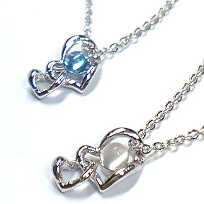 天然石ペンダント ネックレス 女性用 日本製 ムーンストーンorブルートパーズ 小豆チェーン アジャスター付き 揺れるハートが可愛い ダブルハート