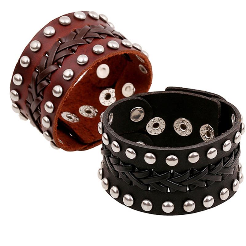 ブレスレット メンズ 男性用 男女兼用 本革 牛革 幅広 ハンドメイド 欧米風 レトロ パンク 幾何学模様 ブラック ブラウン