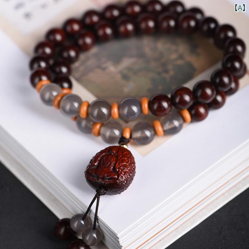 ブレスレット 男女兼用 小葉紫檀 二連 数珠 パワーストーン 瑪瑙 天然石 無相仏 ペンダントトップ 彫刻 高級感 エスニック リゾートスタイル