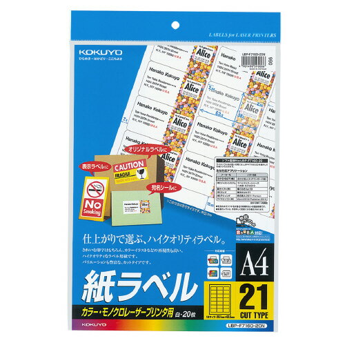 コクヨ LBP用紙ラベル カラー&モノクロ対応 A4 20枚入 21面カット LBP-F7160-20N