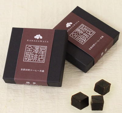 金沢のコーヒー専門店キャラバンサライ コーヒー・スイーツ一覧はこちらから 可愛い小箱入り珈琲ようかん 2箱組。 こちらの商品は賞味期限が21日以上のものをお届けしています。 製 造 者 キャラバンサライ株式会社 石川県金沢市保古3-47 coco彩果 セレクト自家焙煎コーヒー専門店キャラバンサライのオリジナル「コーヒー羊羹」と「カカオ羊羹」。 和と洋の美味しさがひとつになった食感も楽しい、半干しタイプの新感覚の洋風羊羹です。 コーヒーや緑茶のお供にぴったり!贈り物にも最適な可愛い小箱入りです。 ※「カカオ羊羹」は天然のカカオ豆を使用しているため、温度が28度を超えるとココアバターが表面に溶け出し固まることにより表面に白く浮き出る場合があります。 品質には問題はありませんが本来の風味が損なわれる為、4月〜10月まで販売を休止させて頂いております。何卒ご了承いただきますようお願い申し上げます。 キャラバンサライではコーヒー専門店だからできる、そんなお菓子を作りたい・・・との思いから焼き菓子などの製造にいろいろと取り組んでいます。 そんな中でヒット商品となったコーヒーブランデーケーキ「カフェ・ロワイヤル」に次いでチャレンジしたのが、金沢の伝統的な和菓子文化を感じさせる羊羹です。 コーヒーと餡は非常に相性が良いことに着目し、深煎り焙煎したコーヒー豆を微粒子に粉砕し餡に練り込み、煎りたてのコーヒー豆の風味を封じ込めました。 コーヒーの香りとコクが甘い餡とバランスよく馴染んだ美味しい羊羹を一口サイズのキューブ型にカットし、20時間かけて低温で乾燥させることで表面に糖の膜ができ、今迄にない食感の羊羹が完成しました。 新鮮な煎りたての自家焙煎コーヒーから作り上げた新感覚の洋風羊羹はコーヒーや緑茶のお供にぴったり!贈り物にも最適な可愛い小箱入りです。 自家焙煎コーヒーようかん1箱9粒入り 2箱組。