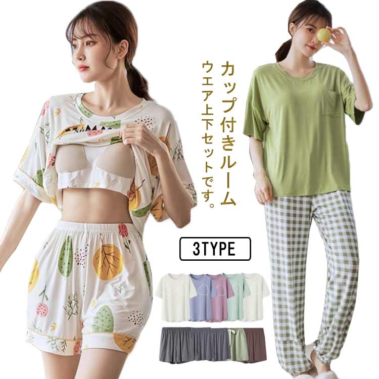 冷感 部屋着 パッド付き ルームウェア 2点セット パジャマ レディース ナイトウェア ナイトブラ ブラ付き 上下セット ショートパンツ 涼しい セットアップ パンツ ゆったり ロングパンツ 寝巻き 肌着 インナー tシャツ オールシーズン 家用 産前 産後 送料無料