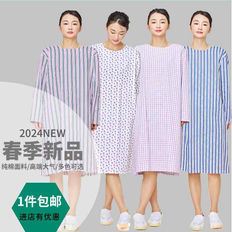 患者衣 病院着 介護 パジャマ 病院 ガウン パジャマ レディース 長袖 前後2WAY 患者 着脱簡単 ロング丈 ストライプ シンプル