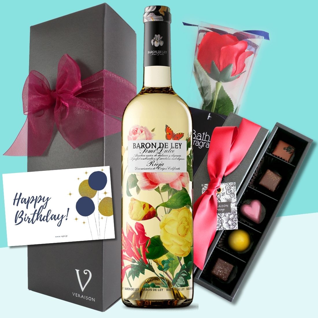 【25日限定最大P10倍 選べるメッセージカード】フラワー チョコレート 花 ワイン ギフト 白ワイン バロン・ド・レイ ブランコ・セミドゥルセ フラワーボトル リボン化粧箱包装 ソープフラワー ボンボンショコラ3個 甘口 スペイン 750ml 誕生日 メッセージ