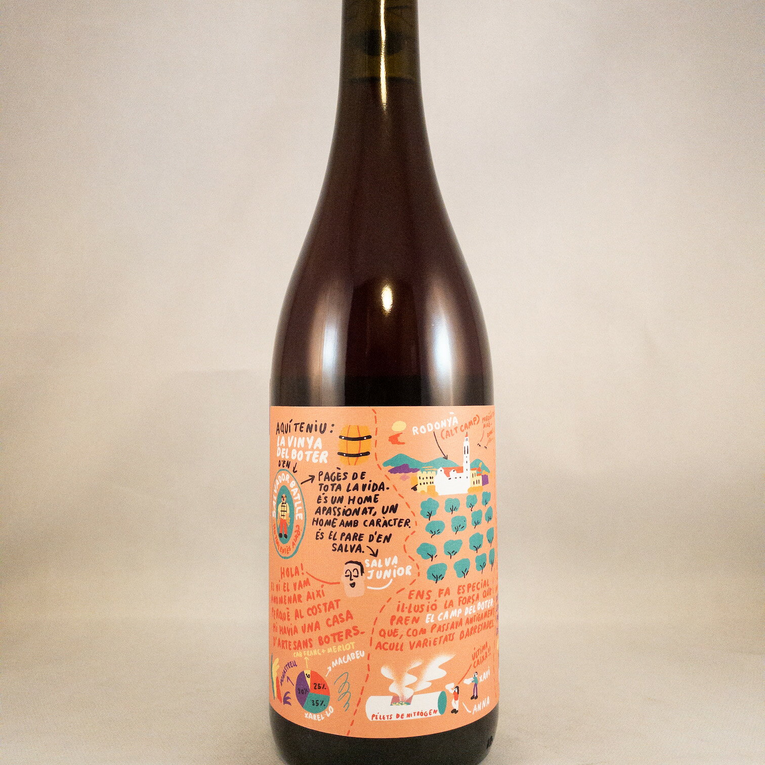 アモール・ペル・ラ・テラ ラ・ヴィニャ・デル・ボテール ロゼ 2020 『Vinya』はカタルーニャ語で『ぶどう畑』。『ボテール』は『樽職人』 。昔はぶどう畑の隣に樽職人が在住していた事からこのネーミングに。 ザクロや野イチゴの赤系果実と、地中海ハーブのアロマが香り、フレッシュで軽やか。甘やかな果実味の後、ほどよい酸味も!赤身のお肉のグリルにフルーツソースを添えたものや、デザートにも良さそうな軽やかさが魅力。 ここでは、ワインの誕生説が描かれています。サルバとサルバの父が話している際、ぶどう栽培者の父が、まだ良質のモナストレルのぶどうが残っていると。この時既に、サルバの頭の中ではモナストレルと酸味の強いパレリャーダをブレンドし、ロゼを造ろうと考えていました。チームに相談したところ、皆賛成。このワインは計画して出来たワインではなく、閃きで出来たワイン。正に『造ってくれー』とぶどうから問いかけられたようだった。 ステンレス発酵。除梗100%、とても優しく破砕し全ての品種を混醸造。ステンレスタンクで4時間のコールドマセラシオンと発酵。SO2無添加。 産地:スペイン/カタルーニャ品種:モナストレル、マカベウ、チャレッロ、メルロ、カベルネ・フラン容量:750ml