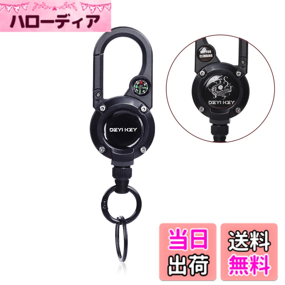 【送料無料】happykau リールキーホルダー リールストラップ 金属 ワイヤー で 丈夫 キーリール コンパス付き カラビナ リール キーチェーン 伸びる キーホルダー 紛失防止 伸縮 釣り 色:ブラック、サイズ:15cm x 4.2cm x 70cm