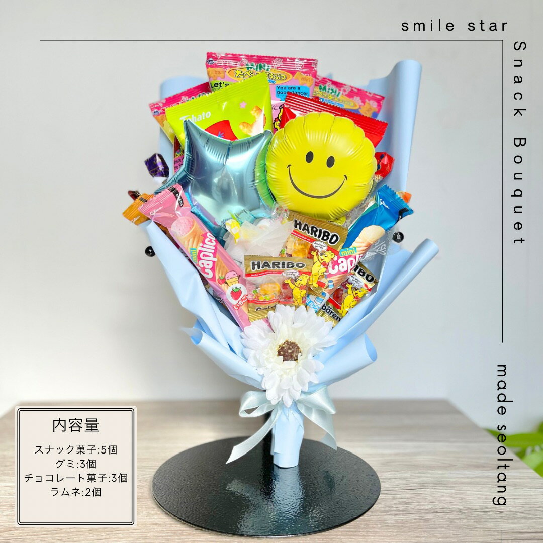 スナックブーケ Smile Star ブルー 手持ちブーケ チョコレート ビスケット ラムネ グミ お菓子ブーケ バルーン 花束 記念日 イベント 結婚式 造花 贈答