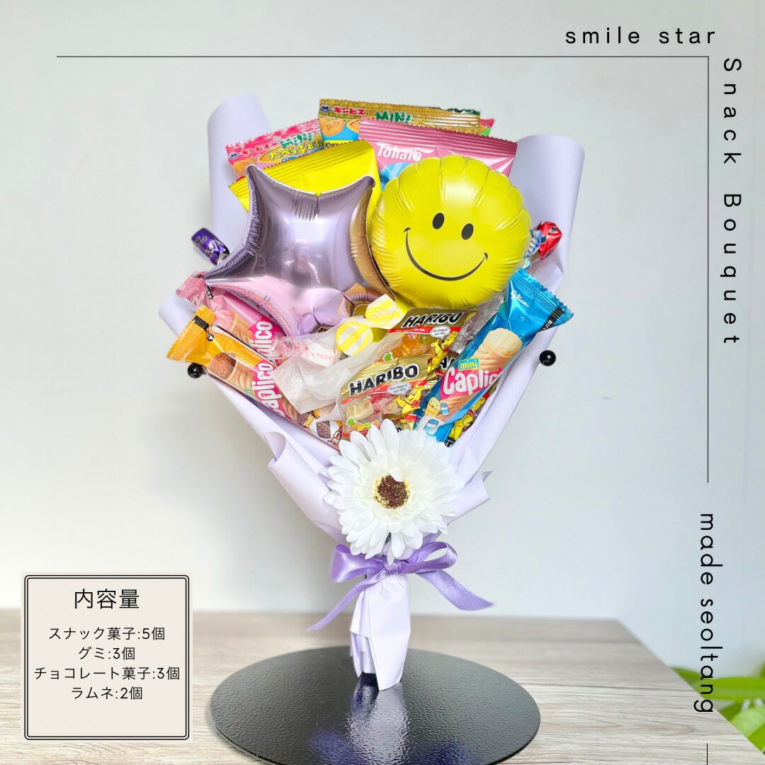 スナックブーケ Smile Star パープル 手持ちブーケ チョコレート ビスケット ラムネ グミ お菓子ブーケ バルーン 花束 記念日 イベント 結婚式 造花 贈答