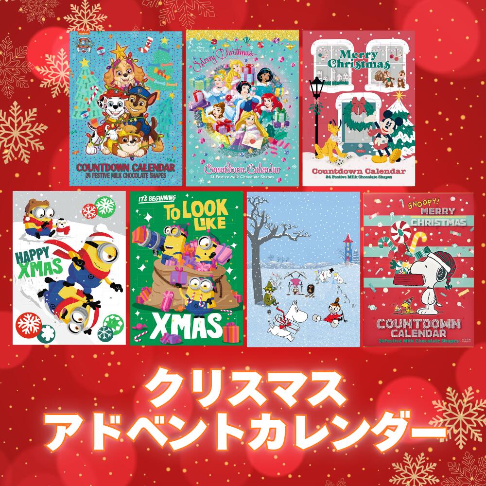 (1)ミニオン アドベントカレンダー ミニオンたちとクリスマスまでカウントダウン!毎日ワクワクのアドベントカレンダー 24個の窓をめくると、中からクリスマスモチーフの「フィギュアチョコレート」が出てくるアドベントカレンダーです。チョコレートを食べると、トレイの下からかわいいミニオンたちの絵が現れる「お楽しみ」付き!ミニオンズと一緒に、クリスマスイブまでの毎日を楽しくカウントダウンしましょう。お子様へのクリスマスプレゼントやお菓子ギフトにも最適です。 特徴: 窓は24個、フィギュアチョコレート入り 仕掛け: チョコレートを食べると、トレイの下にミニオンの絵が現れる 原材料 砂糖、ココアバター、全粉乳、カカオマス、ホエイパウダー/乳化剤 アレルギー情報 一部に乳成分、大豆を含む (2)ミッキー アドベントカレンダー(デザインリニューアル) ミッキーと楽しむクリスマス!デザインリニューアル版アドベントカレンダー 毎年人気のミッキーのアドベントカレンダーが「デザインリニューアル」で登場!24個の窓には、クリスマスモチーフのかわいい「フィギュアチョコレート」が入っています。箱の裏面は「切り取ってメッセージが書ける」ようになっており、クリスマスのメッセージカードとしても使えます。ミッキー&フレンズと一緒にクリスマスイブまでカウントダウン! 特徴: 窓は24個、フィギュアチョコレート入り 仕掛け: デザインリニューアル、箱の裏面がメッセージカードになる 原材料 砂糖、ココアバター、全粉乳、カカオマス、ホエイパウダー/乳化剤 アレルギー情報 一部に乳成分、大豆を含む (3)ムーミン アドベントカレンダー ムーミン谷の仲間たちと過ごすクリスマス。北欧デザインのアドベントカレンダー ムーミンやミイたちと一緒にクリスマスイブまでカウントダウンできる、ムーミンのアドベントカレンダーです。24個の窓を開けると、クリスマスモチーフの「フィギュアチョコレート」がお目見え。チョコレートを食べ終わったトレイの下には、かわいいムーミンたちの「絵が現れる」仕掛けも。クリスマスのワクワク感を高めるお菓子カレンダーです。 特徴: 窓は24個、フィギュアチョコレート入り 仕掛け: チョコレートを食べると、トレイの下にムーミンの絵が現れる 原材料 砂糖、ココアバター、全粉乳、カカオマス、ホエイパウダー/乳化剤 アレルギー情報 一部に乳成分、大豆を含む (4)パウ・パトロール アドベントカレンダー パウ・パトロールの仲間と出動!クリスマス・カウントダウンカレンダー 大人気「パウ・パトロール」のカウントダウンカレンダーが登場!24個の窓をめくると、中からクリスマスモチーフの「フィギュアチョコレート」が出てきます。チョコレートを食べた後のトレイの下には、チェイスやマーシャルたち「パウ・パトロールの仲間たちのイラスト」が隠れています。クリスマスプレゼントにも喜ばれること間違いなしのお菓子です。 特徴: 窓は24個、フィギュアチョコレート入り 仕掛け: チョコレートを食べると、トレイの下にパウ・パトロールのイラストが現れる 原材料 砂糖、ココアバター、全粉乳、カカオマス、ホエイパウダー/乳化剤 アレルギー情報 一部に乳成分、大豆を含む (5)プリンセス アドベントカレンダー(デザインリニューアル) プリンセスたちと夢のクリスマス。飾れるアドベントカレンダー 憧れのプリンセスたちと一緒にクリスマスイブまでカウントダウン!24個の窓には、クリスマスモチーフの「フィギュアチョコレート」が入っています。今年は「デザインがリニューアル」され、さらに魅力的になりました。箱の裏面は「切り取ってオーナメントとして飾れる」特別仕様。クリスマスツリーの飾りとしても楽しめる、素敵なギフトです。 特徴: 窓は24個、フィギュアチョコレート入り 仕掛け: デザインリニューアル、箱の裏面がオーナメントとして飾れる 原材料 砂糖、ココアバター、全粉乳、カカオマス、ホエイパウダー/乳化剤 アレルギー情報 一部に乳成分、大豆を含む (6)サンリオキャラクターズ アドベントカレンダー(新登場・リニューアル) サンリオキャラクターズが新登場!飾ってかわいいアドベントカレンダー ハローキティやマイメロディなど、サンリオキャラクターズのカウントダウンカレンダーが「新登場」&「デザインリニューアル」!24個の窓には、クリスマスモチーフの「フィギュアチョコレート」入り。箱の裏面は「切り取ってスタンドさせれば、かわいい飾りに」なる優れもの。サンリオ好きにはたまらない、クリスマスまでの楽しいお菓子カレンダーです。 特徴: 窓は24個、フィギュアチョコレート入り 仕掛け: 新登場、デザインリニューアル、箱の裏面がスタンド式の飾りになる 原材料 砂糖、ココアバター、全粉乳、カカオマス、ホエイパウダー/乳化剤 アレルギー情報 一部に乳成分、大豆を含む (7)スヌーピー アドベントカレンダー スヌーピーと仲間たちと迎えるクリスマス。1日1個め