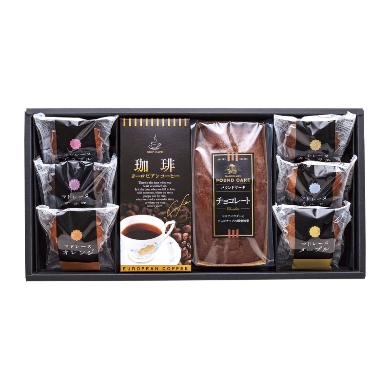スイートバスケットケーキ・焼き菓子詰合せPM-BE【シンプルな化粧箱のため、仏事返礼品としてもお使いいただけます】(香典返し/志/満中陰/弔事/会葬御礼/法要/法事/忌明け/四十九日/一周忌/三回忌/法要/偲び草/粗供養/初盆/供物/お供え)【セールスポイント】しっとりとした6種のマドレーヌとパウンドケーキをセットにしたティータイムにもピッタリな詰め合わせです。【パッケージサイズ】395×60×200mm【内容】チョコケーキ200g×1、マドレーヌ×6(メープル・ミルク・カフェラテ・アップル・オレンジ・チョコ×各1)、コーヒー(ヨーロピアンブレンド)7g×4P×1【生産国】日本【パッケージ形態】化粧箱入【保存方法】常温【賞味期限】製造日より約120日
