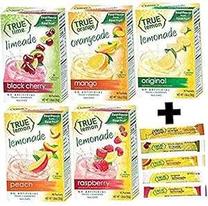 True Lemon Assorted Beverage Pack: (5boxes 10ct each) with 5 FREE BONUS Sticks of Lemonade! True Lemon Original True Peach Lemonade, True Black Cherry Limeade, True Mango Orange and True Raspberry Assorted True Lem