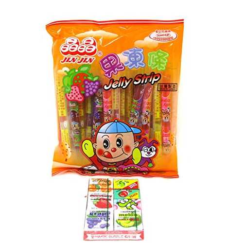 Jin Jin フルーツ ゼリー入りストリップ ストロー キャンディ バンドルにはバブルガム 7 パックが付属 - さまざまなフレーバーがあります。(1パック) Jin Jin Fruit Jelly Filled Strip Straws Candy Bundle come with 7 Pack Bubble Gum- Many