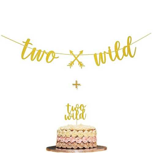 Wulagogo Two Wild Gold Glitter Banner Sign with Two Wild Cake Topper for Two Wild Boho Tribal Themed 2nd Birthday Party Supplies