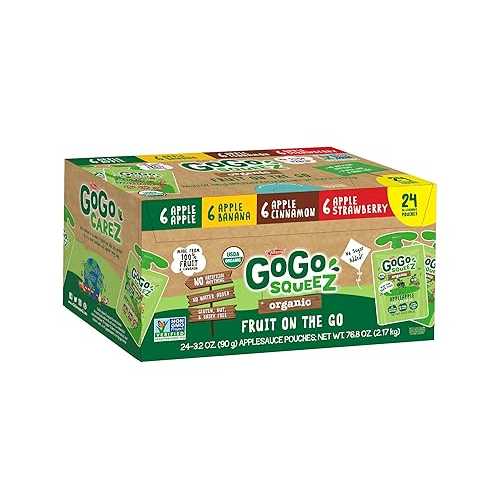 GoGo squeeZ アップルソース オン ザ ゴー、バラエティパック (アップル/バナナ/シナモン/ストロベリー)、3.2 オンス (24 パウチ)、グルテンフリー、ビーガン対応、ヘルシースナック、無糖、再密閉可能、BPA フリーパウチ GoGo squeeZ Applesauce on the