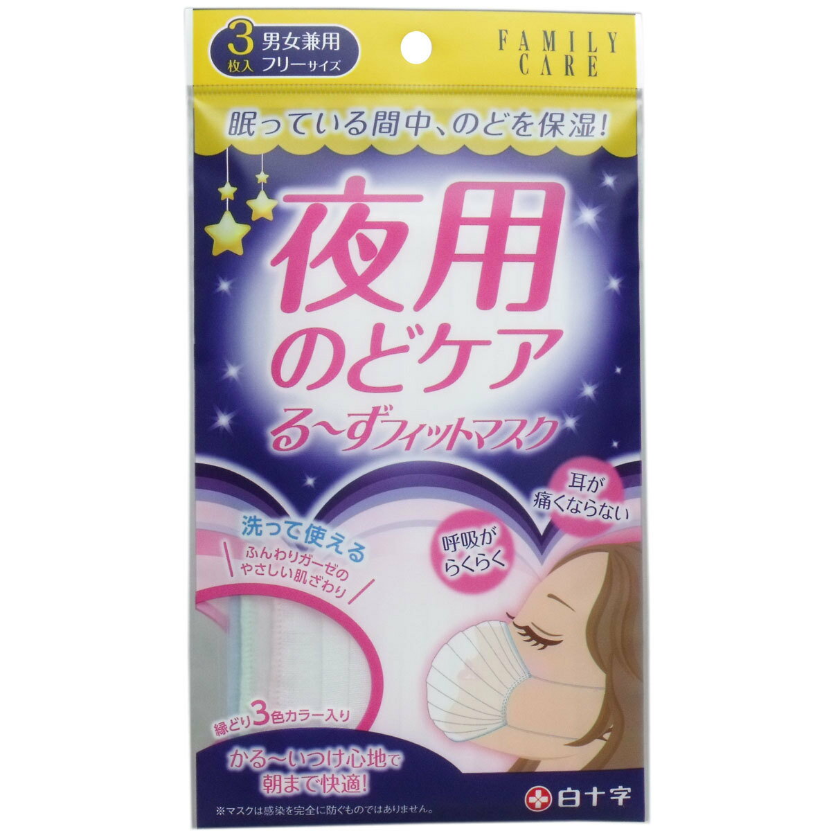 商品情報商品説明就寝中、のどを保湿するおやすみ用のマスクです。ふんわり1枚ガーゼ生地で、呼吸をさまたげません。直径約0.5mmの極細ゴム(耳かけ)を採用し、耳が痛くなりにくく、長時間の使用でも耳が痛くなりません。薄くて軽いので、睡眠時にも装着の違和感がありません。上下のない立体構造10段オメガプリーツ形状の為、暗闇でも装着が簡単です。マスクの淵が3色アソートカラーで、家族みんなで使用の際にも使い分けに便利です。洗って使えるふんわりガーゼマスクです。※予告なく成分・パッケージが変更になることがございます。予めご了承ください。原材料本体・・・ガーゼ耳ひも部・・・ポリウレタン原産国・製造国中国サイズ120mm×90mm 個装サイズ119X209X2mm重量10gご使用上の注意・乳幼児や呼吸器系に異常のある方は、ご使用をおやめください。・肌の異常時及び肌に合わない場合は、ご使用を中止してください。・ご使用の際、マスクの臭いで気分が悪くなった場合や、息苦しさを感じた場合は、ご使用を中止してください。・マスクを濡らしてのご使用はおやめください。・やさしい手洗いでの再使用は可能ですが、多少の形状変化の恐れがあります。・アイロンを用いる場合は、熱に弱い耳掛け部を避けてご使用ください。・有害な粉塵やガス等を防ぐ目的でのご使用はおやめください。・乳幼児の手の届かないところに保管してください。お問合せ先白十字株式会社 お客様相談室0120-018910【受付時間】9:00〜17:00(土・日・祝日・年末年始を除く)発売元白十字株式会社文 責株式会社IDKこの商品は 白十字 FC る〜ずフィットマスク 3枚 洗える ふんわりガーゼ のど保湿 超極細耳かけ 縁取り3色 呼吸らくらく 快適装着 上下無 就寝用 軽い 立体 10段プリーツ ポイント 就寝用マスク/保湿/かるい/やわらか/洗える/立体構造 ショップからのメッセージ 納期について 4