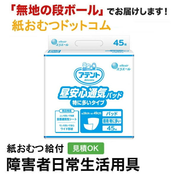アテント 昼安心通気パッド 特に多いタイプ 45枚入 メーカー:大王製紙株式会社 サイズ:28cm×49cm 尿吸収量:600mL(約4回分の吸収) 商品特徴 ・医療費控除対象商品 ・やわらかな通気性バックシート採用 通気性バックシート採用で、ムレを低減。排尿後でもお肌快適。 布のようなやわらかい手触りの「クロスライクバックシート」。 ・モレを防いで安心 おしりをしっかり包み込む吸収体。 ワイド形状吸収体。 立体ギャザーと平面ギャザーで脚まわりにしっかりフィット。 ・吸収体全面で尿を効率吸収 すばやく吸収体全面に尿を拡散。 「拡散スリット」で尿を効率よく吸収してモレ防止。 ・センターラインで装着しやすい工夫 吸収体の「狭い方」がわかりやすいデザイン。 矢印の先端は、吸収体の「狭い方」を示します。