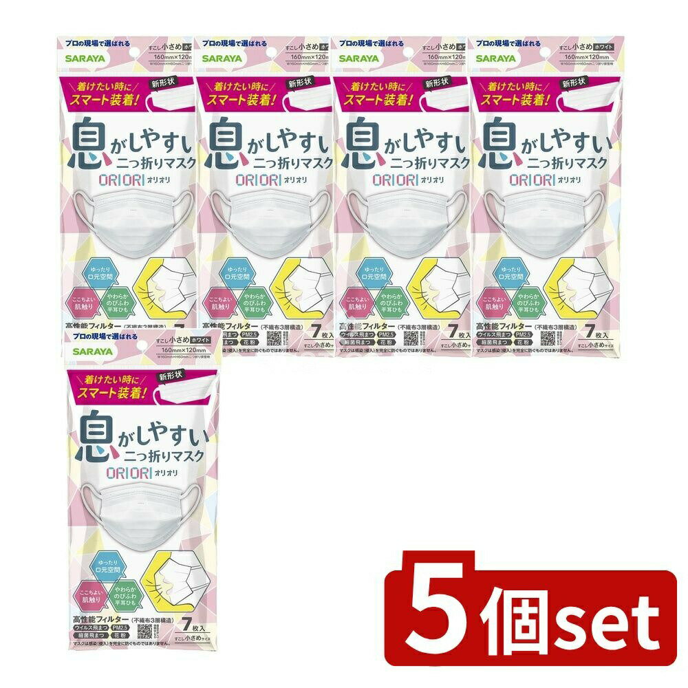 \レビュー特典有/【5個セット】 サラヤ 二つ折りマスクORIORI すこし小さめ [単品内容量/7枚] | サラヤ マスク 二つ折りマスク オリオリ 不織布マスク 立体マスク 小さめマスク 使い捨てマスク 平耳ひも ノーズワイヤー マスク3層構造 口元空間