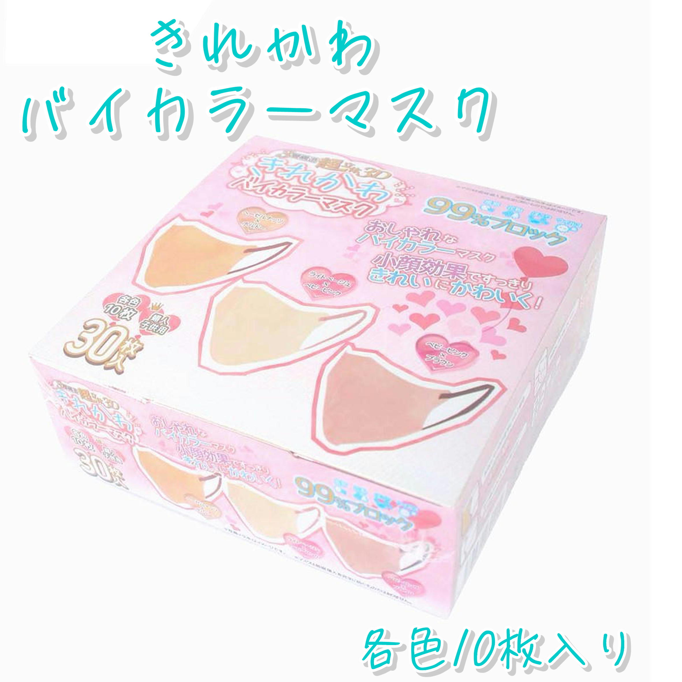 きれかわバイカラーマスク 30枚入 マスク 3層構造 おしゃれなバイカラーマスク 【定形外】小顔効果ですっきりかわいく 超立体3D 各色10枚 婦人 子供用 不織布マスク 99% ブロック サラサラ 耳が痛くなりにくい メガネがくもりにくい