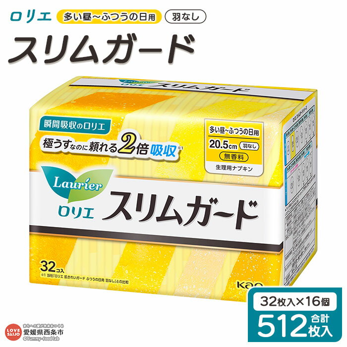 【ふるさと納税】<ロリエ スリムガード 多い昼~ふつうの日用 羽なし 計512枚(32枚入り×16個)>※最短2週間~1か月程度で順次出荷 花王 生理用品 ナプキン 羽無し 20.5cm サニタリー 日用品 消耗品 生活用品 生活雑貨 防災グッズ 備蓄 愛媛県 西条市