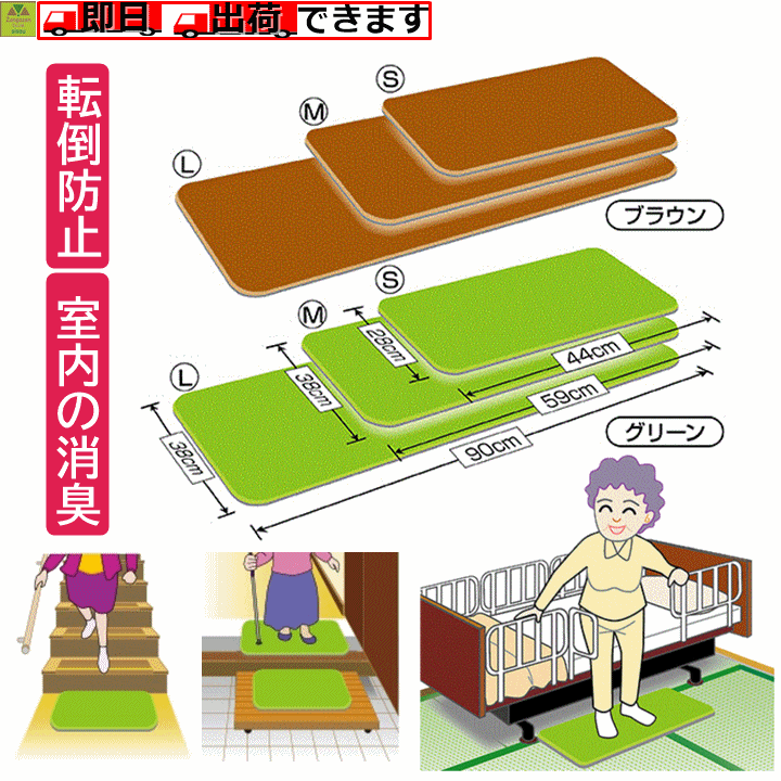 ■■■ ■■■ 商品詳細 消臭とすべり止めの二重構造マット ■ベッドサイドに!!! すべりやすい畳の部屋でも安心 ■階段の降り口に!!! 降り口がすべりにくく最後まで安心 ■玄関に!!! 玄関や玄関台のすべり止めに 《特長》 ◆ゼオライトで消臭効果は抜群!! ◆セシオンで抗菌・遠赤外線効果。 ◆発砲構造で蓄熱・増幅作用があり暖かい。 ◆汚れても簡単に洗えて素早く乾燥します。 ※洗っても消臭効果は繰り返し持続します。 《構造》 【表面】 ●ゼオシーター すべり止めと消臭効果、クッション性があり温かく安全です。 【底面】 ●ゴムマット 裏底はすべらないと定評のあるダイヤカットを使用しておりますのでズレたりすべったりの転倒事故防止になります。 商品仕様 【サイズ】 Sサイズ 長さ44×巾28×厚さ0.5cm Mサイズ 長さ59×巾38×厚さ0.5cm Lサイズ 長さ90×巾38×厚さ0.5cm 【重量】 Sサイズ:370g Mサイズ:660g Lサイズ:1,000g 【カラー】グリーン・ブラウン 【材質】ゼオシータ・ゴム 【製造】日本神戸製 【メーカー】シンエイテクノ(株) 注意事項 商品画像は色合いや素材感が実際の商品と異なる場合がございます。 北海道・沖縄・離島・一部地域は追加送料を別途請求させて頂きます。 当店より、お電話かメールにて送料をお知らせし、 ご了承頂いてからの出荷とさせて頂きます。 モニター・ディスプレイによっても写り方が変ります。予めご了承くださいませ。 お問合せ先 株式会社 前後前 宍粟支店(しそうしてん) ※商品のお問合せ、納期、ご注文方法のわからない場合など、お気軽にお電話くださいませ。当店よりかけなおさせていただきます。 ■■■ ■■■