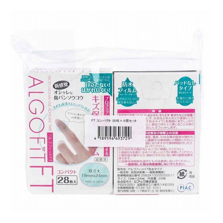 パッドがなく、すっきりとして、目立たないのでオシャレの邪魔をしない傷バンソウコウです。●フィルムタイプと同じ0.03mmの極薄フィルムが、指先・かかとなどの微細なラインにしっかりとフィットし目立ちません。●もっとも素肌に近い感覚のウレタンフィルムの救急バンソウコウです。水絆創膏のようにしみることがありません。●水に強く、驚きの粘着力を保ちます。●すりきず、さかむけ、あかぎれ、日常の軽度な傷に大活躍です。●はがれにくくしっかりフィットし、防水フィルムが傷を守ります。●透明ウレタンフィルム&シリコーン粘着剤だから、貼っていることが目立ちません。●絆創膏の上からスマホ操作が可能です。●コンパクトサイズ:患部だけを覆うコンパクト設計。指の腹側にフィルムがこないので、仕事をするときに違和感が有りません。★こんな時に●水仕事の多い方に●お子様にも安心●衛生が気になる方に●目立ちたくない方に【一般医療機器】一般名称:救急絆創膏(販売免許がなくても販売可能です。)医療機器届出番号:25B3X10005000011【サイズ】コンパクト:19mmX24mm【用途】創傷面の保護(ささくれ、あかぎれ、きりきず、靴ずれなどの保護)【使用方法】患部の汚れ、汗、水気などをふきとり清潔にした後「アルゴフィットFT防水タイプ」を患部にあてしっかり押さえてお貼り下さい。最初つきにくく感じることがありますが、すぐに皮膚になじんでフィットします。【注意】・本品の使用により発疹、発赤、かゆみ等の症状があらわれた場合には、使用を中止し医師又は薬剤師にご相談下さい。・皮膚刺激の発生原因になりますので長時間貼付したり、急激にはがしたりしないでください。・小児の手の届かない所に保管してください。・直射日光を避け、なるべく涼しい所に保管してください。・個包装が破れたり、開封されたりしない限り滅菌効果を保ちます。・品質保持期限を過ぎたものは使用しないで下さい。・一度使用したものは再使用しないでください。個装サイズ:137X100X42mm個装重量:約62g内容量:28枚×4個セット製造国:日本【発売元:ピアック株式会社】【特長】絆創膏※メーカーの都合によりパッケージ、内容等が変更される場合がございます。当店はメーカーコード(JANコード)で管理をしている為それに伴う返品、返金等の対応は受け付けておりませんのでご了承の上お買い求めください。【送料について】北海道、沖縄、離島は送料を頂きます。