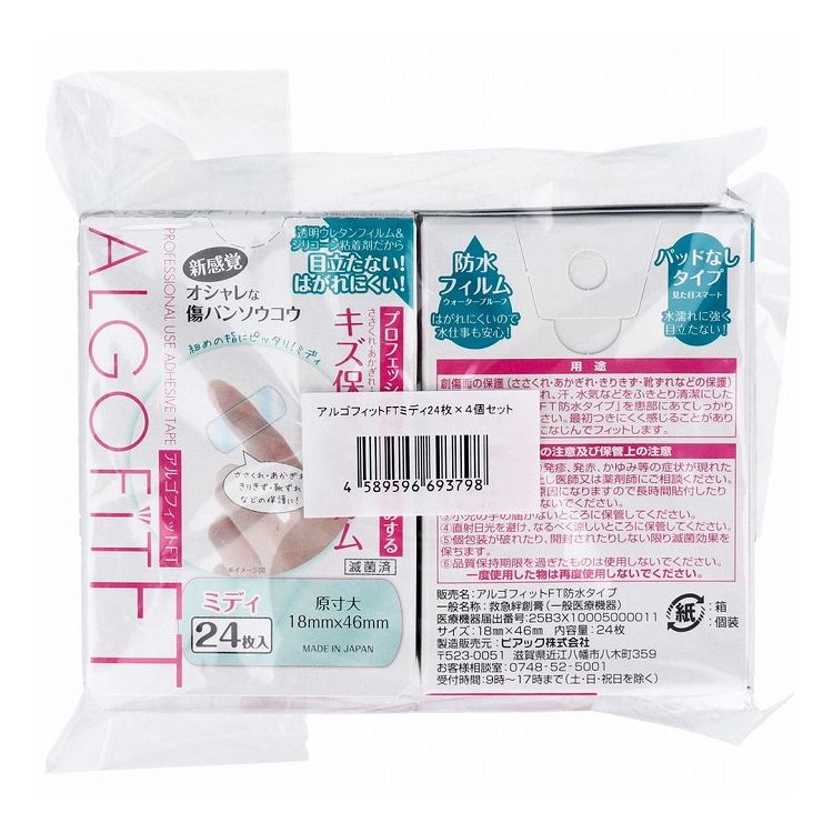 パッドがなく、すっきりとして、目立たないのでオシャレの邪魔をしない傷バンソウコウです。●フィルムタイプと同じ0.03mmの極薄フィルムが、指先・かかとなどの微細なラインにしっかりとフィットし目立ちません。●もっとも素肌に近い感覚のウレタンフィルムの救急バンソウコウです。水絆創膏のようにしみることがありません。●水に強く、驚きの粘着力を保ちます。●すりきず、さかむけ、あかぎれ、日常の軽度な傷に大活躍です。●はがれにくくしっかりフィットし、防水フィルムが傷を守ります。●透明ウレタンフィルム&シリコーン粘着剤だから、貼っていることが目立ちません。●絆創膏の上からスマホ操作が可能です。●ミディサイズ:細い指に向くサイズの絆創膏。●お得な4個セットです。★こんな時に●水仕事の多い方に●お子様にも安心●衛生が気になる方に●目立ちたくない方に【一般医療機器】販売名:アルゴフィットFT防水タイプ一般名称:救急絆創膏(販売免許がなくても販売可能です。)医療機器届出番号:25B3X10005000011【サイズ】ミディ:18mmX46mm【用途】創傷面の保護(ささくれ、あかぎれ、きりきず、靴ずれなどの保護)【使用方法】・患部の汚れ、汗、水気などをふきとり清潔にした後本品を患部にあてしっかり押さえてお貼りください。・最初つきにくく感じることがありますが、すぐに皮膚になじんでフィットします。【注意】・本品の使用により発疹、発赤、かゆみ等の症状が現れた場合には使用を中止し医師又は薬剤師にご相談下さい。・皮膚刺激の発生原因になりますので長時間貼付したり急激にはがしたりしないでください。・小児の手の届かないところに保管してください。・直射日光を避け、なるべく涼しいところに保管してください。・個包装が破れたり、開封されたりしない限り減菌効果を保ちます。・品質保持期限を過ぎたものは使用しないでください。・一度使用したものは再度使用しないでください。個装サイズ:137X100X42mm個装重量:約73g内容量:24枚×4個セット製造国:日本【発売元:ピアック株式会社】【特長】絆創膏※メーカーの都合によりパッケージ、内容等が変更される場合がございます。当店はメーカーコード(JANコード)で管理をしている為それに伴う返品、返金等の対応は受け付けておりませんのでご了承の上お買い求めください。【送料について】北海道、沖縄、離島は送料を頂きます。