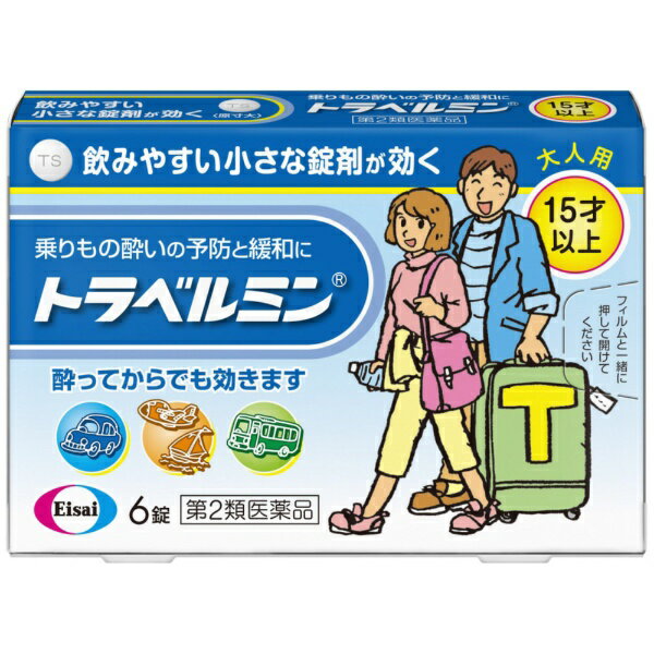 お店TOP>医薬品>乗り物酔い止め・眠気ざまし>乗り物酔い止め>乗り物酔い止め 大人用>トラベルミン (6錠)お一人様3個まで。医薬品に関する注意文言【医薬品の使用期限】使用期限120日以上の商品を販売しております商品区分:第二類医薬品【トラベルミンの商品詳細】●トラベルミンは、乗りもの酔い症状の予防及び緩和に有効な、大人用の乗りもの酔い薬です。酔う心配がある場合、乗る30分前の服用により、乗りもの酔い症状が予防できます。また、酔ってしまった時でも、服用によって乗りもの酔い症状である「めまい」「吐き気」「頭痛」を改善し、旅行を楽しむことができます。【効能 効果】乗物酔いによるめまい・吐き気・頭痛の予防及び緩和【用法 用量】乗物酔いの予防には乗車船30分前に、次の1回量を水またはお湯で服用してください。[年齢:1回量:1日服用回数]成人(15才以上):1錠:4時間以上の間隔をおいて3回まで小児(15才未満):服用しないことなお、追加服用する場合には、1回量を4時間以上の間隔をおいて服用してください。1日の服用回数は3回までとしてください。・錠剤の取り出し方錠剤の入っているシートの凸部を指先で強く押して、裏面のアルミ箔を破り、錠剤を取り出して服用してください。(誤ってシートのままのみこんだりすると食道粘膜に突き刺さるなど思わぬ事故につながります。)【成分】1錠中に次の成分を含みます。[成分:含量]ジフェンヒドラミンサリチル酸塩:40mgジプロフィリン:26mg添加物:タルク、トウモロコシデンプン、乳糖、カルメロースCa、硬化油、酸化チタン、ステアリン酸Ca、セルロース、ヒプロメロース、マクロゴール、無水ケイ酸【注意事項】★してはいけないこと[守らないと現在の症状が悪化したり、副作用・事故が起こりやすくなる]1.次の人は服用しないでください。次の診断を受けた人緑内障、前立腺肥大2.本剤を服用している間は、次のいずれの医薬品も使用しないでください。他の乗物酔い薬、かぜ薬、解熱鎮痛薬、鎮静薬、鎮咳去痰薬、抗ヒスタミン剤を含有する内服薬等(鼻炎用内服薬、アレルギー用薬等)3.服用後、乗物又は機械類の運転操作をしないでください。(眠気等があらわれることがあります。)4.授乳中の人は本剤を服用しないか、本剤を服用する場合は授乳を避けてください。★相談すること1.次の人は服用前に医師、薬剤師又は登録販売者に相談してください。(1)医師の治療を受けている人(2)妊婦又は妊娠していると思われる人(3)薬などによりアレルギー症状を起こしたことがある人(4)次の症状のある人排尿困難(5)次の診断を受けた人てんかん、甲状腺機能障害2.服用後、次の症状があらわれた場合は副作用の可能性があるので、直ちに服用を中止し、添付文書を持って医師、薬剤師又は登録販売者に相談してください。[関係部位:症状]皮膚:発疹・発赤、かゆみ循環器:動悸泌尿器:排尿困難3.服用後、次の症状があらわれることがあるので、このような症状の持続又は増強が見られた場合には、服用を中止し、添付文書を持って医師、薬剤師又は登録販売者に相談してください。口のかわき、眠気★その他の注意本剤服用中、アルコール類を飲用しますと、薬の作用が強くあらわれることがありますので注意してください。★保管及び取扱い上の注意(1)直射日光の当たらない湿気の少ない涼しい所に保管してください。(2)小児の手の届かない所に保管してください。(3)他の容器に入れ替えないでください。(誤用の原因になったり品質が変わります。)(4)使用期限をすぎた製品は使用しないでください。【医薬品販売について】1.医薬品については、ギフトのご注文はお受けできません。2.医薬品の同一商品のご注文は、数量制限をさせていただいております。ご注文いただいた数量が、当社規定の制限を越えた場合には、薬剤師、登録販売者からご使用状況確認の連絡をさせていただきます。予めご了承ください。3.効能・効果、成分内容等をご確認いただくようお願いします。4.ご使用にあたっては、用法・用量を必ず、ご確認ください。5.医薬品のご使用については、商品の箱に記載または箱の中に添付されている「使用上の注意」を必ずお読みください。6.アレルギー体質の方、妊娠中の方等は、かかりつけの医師にご相談の上、ご購入ください。7.医薬品の使用等に関するお問い合わせは、当社薬剤師がお受けいたします。TEL:050-5577-5043email:rakuten24_8@shop.rakuten.co.jp【原産国】日本【ブランド】トラベルミン【発売元、製造元、輸入元又は販売元】エーザイリニューアルに伴い、パッケージ・内容等予告なく変更する場合がございます。予めご了承ください。広告文責:楽天グループ株式会社電話:050-5577-5043・・・・・・・・・・・・・・[乗り物酔い止め/ブランド:トラベルミン/]