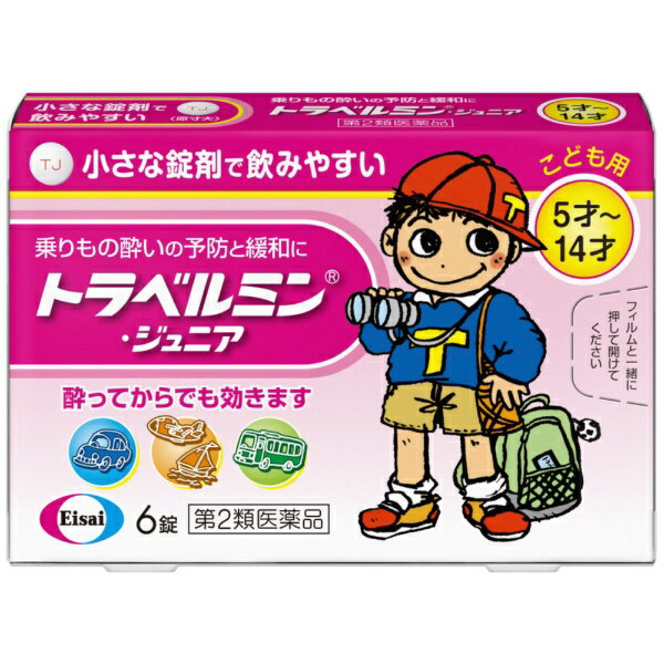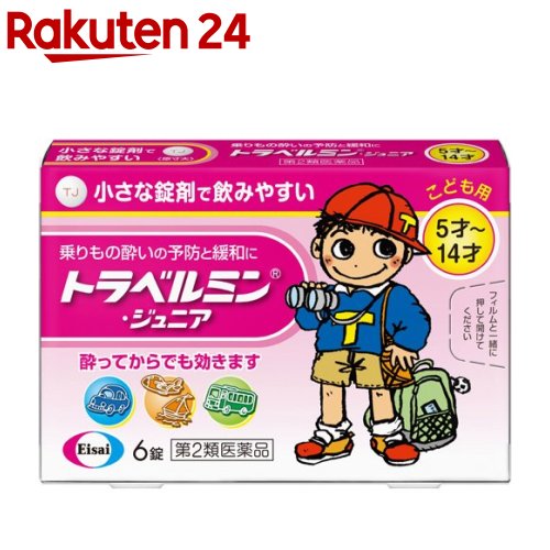 お店TOP>医薬品>乗り物酔い止め・眠気ざまし>乗り物酔い止め>乗り物酔い止め 小児・乳児用>トラベルミンジュニア (6錠)お一人様3個まで。医薬品に関する注意文言【医薬品の使用期限】使用期限120日以上の商品を販売しております商品区分:第二類医薬品【トラベルミンジュニアの商品詳細】●トラベルミン・ジュニアは、乗りもの酔い症状の予防及び緩和に有効な、子供用の乗りもの酔い薬です。酔う心配がある場合、乗る30分前の服用により、乗りもの酔い症状が予防できます。●また、酔ってしまった時でも、服用によって乗りもの酔い症状である「めまい」「吐き気」「頭痛」を改善し、旅行を楽しむことができます。【効能 効果】乗物酔いによるめまい・吐き気・頭痛の予防及び緩和【用法 用量】乗物酔いの予防には乗車船30分前に、次の1回量を水またはお湯で服用してください。[年齢:1回量:1日服用回数]11才〜14才:2錠:4時間以上の間隔をおいて3回まで5才〜10才:1錠:4時間以上の間隔をおいて3回まで5才未満:服用しないことなお、追加服用する場合には、1回量を4時間以上の間隔をおいて服用してください。1日の服用回数は3回までとしてください。★用法・用量に関連する注意小児(5才〜14才)に服用させる場合には、保護者の指導監督のもとに服用させてください。修学旅行などに持たせる場合には、事前に用法、用量など、服用方法をよく指導してください。[錠剤の取り出し方]錠剤の入っているシートの凸部を指先で強く押して、裏面のアルミ箔を破り、錠剤を取り出して服用してください。(誤ってシートのままのみこんだりすると食道粘膜に突き刺さるなど思わぬ事故につながります。)【成分】1回量(5才〜10才)1錠中に次の成分を含みます。成分:含量ジフェンヒドラミンサリチル酸塩:20mgジプロフィリン:13mg添加物:タルク、乳糖、カルメロース、酸化チタン、ステアリン酸Ca、セルロース、ヒプロメロース、マクロゴール、無水ケイ酸【注意事項】・本剤は子供用ですが「使用上の注意」には大人が服用する際のことも書いてあります。★してはいけないこと[守らないと現在の症状が悪化したり、副作用・事故が起こりやすくなる]1.次の人は服用しないでください。次の診断を受けた人緑内障、前立腺肥大2.本剤を服用している間は、次のいずれの医薬品も使用しないでください。他の乗物酔い薬、かぜ薬、解熱鎮痛薬、鎮静薬、鎮咳去痰薬、抗ヒスタミン剤を含有する内服薬等(鼻炎用内服薬、アレルギー用薬等)3.服用後、乗物又は機械類の運転操作をしないでください。(眠気等があらわれることがあります。)4.授乳中の人は本剤を服用しないか、本剤を服用する場合は授乳を避けてください。★相談すること1.次の人は服用前に医師、薬剤師又は登録販売者に相談してください。(1)医師の治療を受けている人(2)妊婦又は妊娠していると思われる人(3)薬などによりアレルギー症状を起こしたことがある人(4)次の症状のある人排尿困難(5)次の診断を受けた人てんかん、甲状腺機能障害2.服用後、次の症状があらわれた場合は副作用の可能性があるので、直ちに服用を中止し、添付文書を持って医師、薬剤師又は登録販売者に相談してください。[関係部位:症状]皮膚:発疹・発赤、かゆみ循環器:動悸泌尿器:排尿困難3.服用後、次の症状があらわれることがあるので、このような症状の持続又は増強が見られた場合には、服用を中止し、添付文書を持って医師、薬剤師又は登録販売者に相談してください。口のかわき、眠気★その他の注意本剤服用中、アルコール類を飲用しますと、薬の作用が強くあらわれることがありますので注意してください。★保管及び取扱い上の注意(1)直射日光の当たらない湿気の少ない涼しい所に保管してください。(2)小児の手の届かない所に保管してください。(3)他の容器に入れ替えないでください。(誤用の原因になったり品質が変わります。)(4)使用期限をすぎた製品は使用しないでください。【医薬品販売について】1.医薬品については、ギフトのご注文はお受けできません。2.医薬品の同一商品のご注文は、数量制限をさせていただいております。ご注文いただいた数量が、当社規定の制限を越えた場合には、薬剤師、登録販売者からご使用状況確認の連絡をさせていただきます。予めご了承ください。3.効能・効果、成分内容等をご確認いただくようお願いします。4.ご使用にあたっては、用法・用量を必ず、ご確認ください。5.医薬品のご使用については、商品の箱に記載または箱の中に添付されている「使用上の注意」を必ずお読みください。6.アレルギー体質の方、妊娠中の方等は、かかりつけの医師にご相談の上、ご購入ください。7.医薬品の使用等に関するお問い合わせは、当社薬剤師がお受けいたします。TEL:050-5577-5043email:rakuten24_8@shop.rakuten.co.jp【原産国】日本【ブランド】トラベルミン【発売元、製造元、輸入元又は販売元】エーザイリニューアルに伴い、パッケージ・内容等予告なく変更