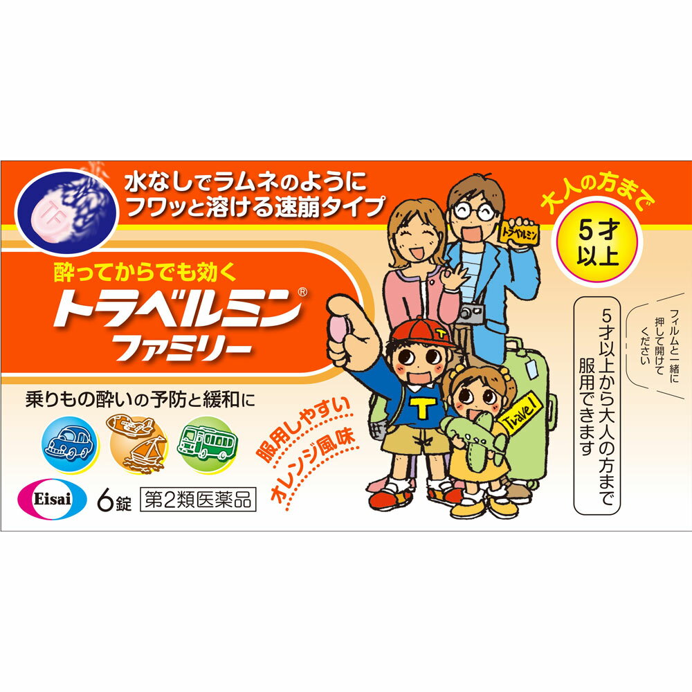 【注意!】こちらの商品は医薬品です。以下の文章を良く読み、設問に必ずお答え下さい。※医薬品は使用上の注意をよく読み用法・用量を守って正しくお使い下さい。 商品名トラベルミンファミリー内容量6錠商品説明●トラベルミン ファミリーは、乗りもの酔い症状の予防及び緩和に有効な乗りもの酔い薬です。●ラムネのようにフワッと溶ける速崩タイプなので、旅行中のバスや電車などの移動中でも水なしで服用できます。●酔ってからでも効く成分を配合しているので、旅行を楽しんでいただけます。●5歳以上のお子様から大人の方まで服用いただけます。使用上の注意●してはいけないこと 〔守らないと現在の症状が悪化したり、副作用・事故が起こりやすくなる〕 1. 本剤を服用している間は、次のいずれの医薬品も使用しないでください。他の乗物酔い薬、かぜ薬、解熱鎮痛薬、鎮静薬、鎮咳去痰薬、胃腸鎮痛鎮痙薬、抗ヒスタミン剤を含有する内服薬等(鼻炎用内服薬、アレルギー用薬等)2. 服用後、乗物又は機械類の運転操作をしないでください。(眠気や目のかすみ、異常なまぶしさ等の症状があらわれることがあります。) ●相談すること 1.次の人は服用前に医師、薬剤師又は登録販売者に相談してください。 (1)医師の治療を受けている人 (2)妊婦又は妊娠していると思われる人 (3)高齢者 (4)薬などによりアレルギー症状を起こしたことがある人 (5)次の症状のある人 排尿困難 (6)次の診断を受けた人 緑内障、心臓病2.服用後、次の症状があらわれた場合は副作用の可能性があるので、直ちに服用を中止し、この説明書を持って医師、薬剤師又は登録販売者に相談してください。[関係部位:症状]皮膚:発疹・発赤、かゆみ精神神経系:頭痛泌尿器:排尿困難その他:顔のほてり、異常なまぶしさ3.服用後、次の症状があらわれることがあるので、このような症状の持続又は増強が見られた場合には、服用を中止し、この説明書を持って医師、薬剤師又は登録販売者に相談してください。 口のかわき、便秘、眠気、目のかすみ効能・効果乗物酔いによるめまい・吐き気・頭痛の予防及び緩和用法・用量乗りもの酔いの予防には、乗りものに乗る30分前に、次の1回量をかむか、口中で溶かして服用してください。 成人(15才以上):2錠:4時間以上の間隔をおいて2回まで11才〜14才:2錠:4時間以上の間隔をおいて2回まで5才〜10才:1錠:4時間以上の間隔をおいて2回まで5才未満:服用しないこと◇5歳未満は服用しないこと ◇なお、追加服用する場合は、1回量を4時間以上の間隔をおいて服用してください。1日の服用回数は2回までとしてください。 [用法・用量に関連する注意] 小児(5才〜14才)に服用させる場合には、保護者の指導監督のもとに服用させてください。修学旅行などに持たせる場合には、事前に用法、用量など、服用方法をよく指導してください。[錠剤の取り出し方]錠剤の入っているシートの凸部を指先で強く押して、裏面のアルミ箔を破り、錠剤を取り出して服用してください。(誤ってシートのままのみこんだりすると食道粘膜に突き刺さるなど思わぬ事故につながります。)成分・分量1回量(11歳以上)2錠中に次の成分を含みます。 塩酸メクリジン 25mg スコポラミン臭化水素酸塩水和物 0.16mg添加物トウモロコシデンプン、D‐マンニトール、l‐メントール、香料、三二酸化鉄、ジメチルポリシロキサン、ステビア抽出精製物、セルロース、ポビドン、無水ケイ酸保管及び取扱上の注意※こちらの商品は、使用期限が【12ヶ月】以上ある商品を販売させていただいております※(1)直射日光の当たらない湿気の少ない涼しい所に保管してください。(2)小児の手の届かない所に保管してください。(3)他の容器に入れ替えないでください。(誤用の原因になったり品質が変わります。)(4)使用期限をすぎた製品は使用しないでください。(5)使用期限内であっても内袋(アルミの袋)を開封した後は、品質保持の点から6ヵ月以内を目安に使用してください。箱の開封口の「開封年月日」欄に、開封日を記入してください。問合せ先エーザイ株式会社「お客様ホットライン室」フリーダイヤル:0120‐161‐454受付時間:平日9:00〜18:00(土、日、祝日9:00〜17:00)製造販売会社(メーカー)サンノーバ株式会社販売会社(発売元)エーザイ株式会社東京都文京区小石川4‐6‐10剤形錠剤リスク区分(商品区分)第2類医薬品広告文責株式会社サンドラッグ/電話番号:0120‐009‐368JANコード4987028110521ブランドトラベルミン※パッケージ・デザイン等は、予告なしに変更される場合がありますので、予めご了承ください。※お届け地域によっては、表記されている日数よりもお届けにお時間を頂く場合がございます。【注意事項】・乗り物にのる30分前に服用して下さい。・修学旅行等に持たせる場合は、事前に服用方法をよく指導して下さい。・乗り物にのるにあたって、前夜は充分に睡眠をとり、当日の食事は飲みすぎ・食べすぎに注意し、体調を整えておきましょう。・お使いに
