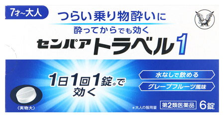 【注意!】こちらの商品は『第2類医薬品』です。以下の文章を良く読み、設問に必ずお答え下さい。尚、お薬に関するご質問は下記電話番号までお問合せください。●株式会社サンドラッグ 【電話番号:0120-009-368】※医薬品は使用上の注意をよく読み用法・用量を守って正しくお使い下さい。 商品名センパアトラベル1内容量6錠商品説明◆センパア トラベル1 は、乗り物酔いによるめまい・吐き気・頭痛の症状を予防・緩和します。◆ 1 日1 回の服用で効果があります。楽しい旅行、快適な移動をお手伝いします。◆水がなくても、口中で溶かすか又はかみくだいて、そのまま服用できるグレープフルーツ風味のチュアブル錠です。◆気分が悪くなってから服用しても効果があります。使用上の注意●してはいけないこと(守らないと現在の症状が悪化したり、副作用・事故が起こりやすくなります)1、本剤を服用している間は、次のいずれの医薬品も使用しないでください。他の乗物酔い薬、かぜ薬、解熱鎮痛薬、鎮静薬、鎮咳去痰薬、胃腸鎮痛鎮痙薬、抗ヒスタミン剤を含有する内服薬等(鼻炎用内服薬、アレルギー用薬等)2、服用後、乗物又は機械類の運転操作をしないでください(眠気や目のかすみ、異常なまぶしさ等の症状があらわれることがあります)●相談すること1、次の人は服用前に医師、薬剤師又は登録販売者に相談してください(1)医師の治療を受けている人。(2)妊婦又は妊娠していると思われる人。(3)高齢者。(4)薬などによりアレルギー症状を起こしたことがある人。(5)次の症状のある人。排尿困難(6)次の診断を受けた人。緑内障、心臓病2、服用後、次の症状があらわれた場合は副作用の可能性があるので、直ちに服用を中止し、この説明書を持って医師、薬剤師又は登録販売者に相談してください皮膚:発疹・発赤、かゆみ精神神経系:頭痛泌尿器:排尿困難その他:顔のほてり、異常なまぶしさまれに下記の重篤な症状が起こることがあります。その場合は直ちに医師の診療を受けてください。再生不良性貧血:青あざ、鼻血、歯ぐきの出血、発熱、皮膚や粘膜が青白くみえる、疲労感、動悸、息切れ、気分が悪くなりくらっとする、血尿等があらわれる。無顆粒球症:突然の高熱、さむけ、のどの痛み等があらわれる。3、服用後、次の症状があらわれることがあるので、このような症状の持続又は増強が見られた場合には、服用を中止し、この説明書を持って医師、薬剤師又は登録販売者に相談してください。口のかわき、便秘、眠気、目のかすみ効能・効果乗物酔いによるめまい・吐き気・頭痛の予防及び緩和用法・用量次の量をかむか、口中で溶かして服用してください。乗物酔いの予防には乗車船の30分前に服用してください。15歳以上:1日1回1錠7歳〜14才:1日1回1/2錠7歳未満:服用しない事成分・分量1錠中クロルフェニラミンマレイン酸塩 :4mgスコポラミン臭化水素酸塩水和物:0.25mg添加物還元麦芽糖水アメ、トウモロコシデンプン、ヒドロキシプロピルセルロース、無水ケイ酸、アスパルテーム(L?フェニルアラニン化合物)、ステアリン酸Mg、香料、オクテニルコハク酸デンプンNa保管及び取扱上の注意(1)直射日光の当たらない湿気の少ない涼しい所に保管してください。(2)小児の手の届かない所に保管してください。(3)他の容器に入れ替えないでください。(誤用の原因になったり品質が変わることがあります)(4)使用期限を過ぎた製品は服用しないでください。問合せ先会社名:大正製薬株式会社問い合わせ先:お客様119番室電話:03-3985-1800受付時間:8:30〜21:00(土、日、祝日を除く)製造販売会社会社名:大正製薬株式会社住所:東京都豊島区高田3丁目24番1号販売会社会社名:大正製薬株式会社住所:東京都豊島区高田3丁目24番1号剤形錠剤商品区分第2類医薬品広告文責株式会社サンドラッグ/電話番号:0120-009-368JAN4987306028678ブランドセンパア※パッケージ・デザイン等は、予告なしに変更される場合がありますので、予めご了承ください。※お届け地域によっては、表記されている日数よりもお届けにお時間を頂く場合がございます。【注意事項】・乗り物にのる30分前に服用して下さい。なお、こちらのお薬の使用前後は、飲酒を控えて下さい。・修学旅行等に持たせる場合は、事前に服用方法をよく指導して下さい。・乗り物にのるにあたって、前夜は充分に睡眠をとり、当日の食事は飲みすぎ・食べすぎに注意し、体調を整えておきましょう。・服用後、乗物又は機械の運転操作をする際は、服用から十分に時間を置いて下さい。製品によって異なりますが、少なくとも、服用当日は控えていただくことをお勧めします。・お使いになって何か気になる症状が出た場合は、使用を中止し、医師・薬剤師・登録販売者にご相談下さい。・使用前に、よく添付文書をお読みになってからご使用下さい。・その際、ご不明な点がございましたら、薬剤師・登録販売者にご相談下さい。4987306028678