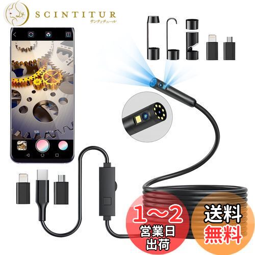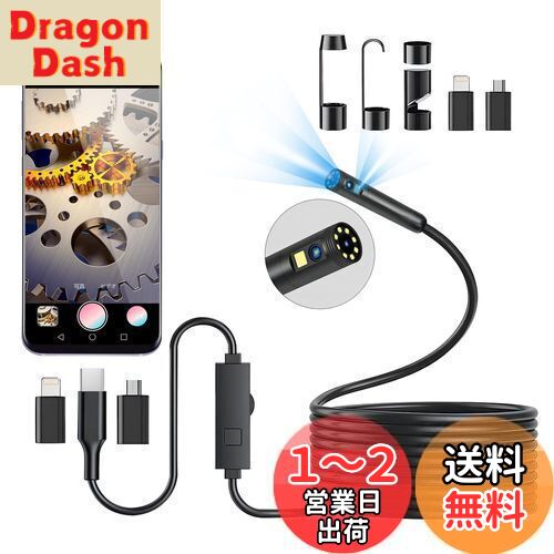 商品情報商品の説明主な仕様 【3-in-1多機能ボアスコープ】DPductボアスコープカメラは3つのアダプタが付属しています。 IOS携帯電話、Android携帯電話、Type C携帯電話(Android 4.2以上、iOS 9.0以上)に対応し、不測の事態でも簡単に携帯電話を変更できます。 良い製品は常に制限が少ない。br【デュアルレンズボアスコープカメラ】両レンズとも270万画素カメラ(19020*1080P)、撮像は高速、滑らかで鮮明です。7.8mm超ファインカメラ専用アプリでリアルタイム動画閲覧、静止画撮影、録画、保存、撮影した静止画や動画の再生が可能です。車のエンジン内部、エアコン、水道管など、狭くて複雑な場所の検査に適しています。br【高輝度&無段階調光】暗い環境でも十分な明るさを確保できるよう、ヘッド部に8個のLEDライトを搭載し、サイドにもライトを追加しました。 マイクロスコープはダイヤルスイッチで無段階に光量を調整できるため、最も見やすい光量への調節が簡単にできます。拡大機能もついているため、細かな場所も拡大することでしっかりと把握することができるようになっており、点検や修理の際にも鮮明な画像が確認できます。br【IP67防水】ケーブルはIP67の防水性能を備えているため、濡れた配管や水中でも使用可能。ケーブルに油などが付着した場合は、直接水で洗浄できる。ケーブルは扱いやすい形状固定タイプで、任意の角度で固定できるため、障害物に遭遇しても、上手な取り回しで回避・前進させることができる。br【満足のいくサービス】内視鏡カメラ*1、5Mセミリジッドケーブル*1、付属品:マグネット*1、フック*1、ミラー*1、保護キャップ*1、マニュアル*1、Lightningコンバーター*1, Androidコンバーター*1。 24 時間のプロフェッショナルで親切なアフターサービスと。 内視鏡カメラについてご不明な点がございましたら、お気軽にお問い合わせください。 私たちは常に最高のサービスを提供するためにここにいます。