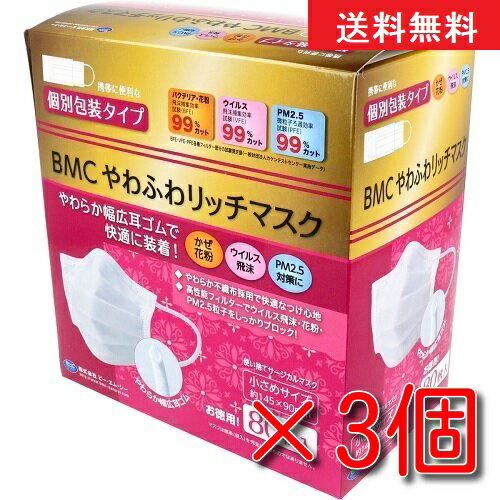 [ 3箱 セット ] BMC やわふわ リッチマスク 小さめ 個別包装 80*3 計240枚 [送料無料][ 4580116956072] bmcマスク ビー・エム・シー 耳が痛くない 極太やわらか耳ゴム ノーズワイヤー ウイルス 衛生 飛沫対策