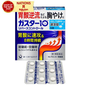 【必ずご確認ください】 ご注文内容に第1類医薬品が含まれる場合はご注文は確定されません。 ご注文後、購入履歴の詳細画面より服用に関する注意事項をご確認の上、 承諾していただく必要がございます。 承諾していただくことでご注文確定となります。 薬剤師が第1類医薬品をご使用いただけないと判断した場合は、第1類医薬品を含むすべてのご注文がキャンセルとなります。 あらかじめご了承くださいますようお願い致します。 >>第1類医薬品を含むご注文後の流れについて詳しくはコチラをご覧ください。 お買い上げいただける個数は3個までです リニューアルに伴いパッケージ・内容等予告なく変更する場合がございます。予めご了承ください。 名 称 第一三共ヘルスケア ガスター10 錠 内容量 12錠 特 徴 ◆本剤は胃酸中和型の胃腸薬とは異なるタイプの胃腸薬で、胃痛・もたれなどにすぐれた効果を発揮します。 ◆胃の不快な症状の原因となる胃酸の出過ぎをコントロールし、胃粘膜の修復を促します。 ◆携帯にも便利なPTP包装です。 効能・効果 胃痛、胸やけ、もたれ、むかつき (本剤はH2ブロッカー薬を含んでいます) ●効能・効果に関連する注意 効能・効果に記載以外の症状では、本剤を服用しないで下さい。 用法・用量 胃痛、胸やけ、もたれ、むかつきの症状があらわれた時、次の量を、水又はお湯で服用して下さい。 【年齢:1回量:1日服用回数】 成人(15歳以上、80歳未満):1錠:2回まで 小児(15歳未満):服用しないで下さい。 高齢者(80歳以上):服用しないで下さい。 ・服用後8時間以上たっても症状が治まらない場合は、もう1錠服用して下さい。 ・症状が治まった場合は、服用を止めて下さい。 ・3日間服用しても症状の改善がみられない場合は、服用を止めて、医師又は薬剤師に相談して下さい。 ・2週間を超えて続けて服用しないで下さい。 ●用法・用量に関連する注意(1)用法・用量を厳守して下さい。 (2)本剤を服用の際は、アルコール飲料の摂取は控えて下さい。 (薬はアルコール飲料と併用しないのが一般的です) 成分・分量 本剤は糖衣錠で、1錠中に次の成分を含有しています。 ファモチジン・・・10mg (胃酸の出過ぎをコントロールします。) 添加物:リン酸水素Ca、セルロース、乳糖、ヒドロキシプロピルセルロース、トウモロコシデンプン、無水ケイ酸、ステアリン酸Ca、白糖、乳酸Ca、マクロゴール、酸化チタン、タルク、カルナウバロウ 区 分 医薬品/商品区分:第1類医薬品/ヒスタミンH2受容体拮抗剤含有薬、H2ブロッカー胃腸薬/日本製 ご注意 ・3日間服用しても症状の改善がみられない場合は、服用を止めて、この文書を持って医師又は薬剤師に相談して下さい。 ・2週間を超えて続けて服用しないで下さい。 (重篤な消化器疾患を見過ごすおそれがありますので、医師の診療を受けて下さい) 使用上の注意 ●してはいけないこと (守らないと現在の症状が悪化したり、副作用が起こりやすくなります) 1.次の人は服用しないで下さい。 (1)ファモチジン等のH2ブロッカー薬によりアレルギー症状(例えば、発疹・発赤、かゆみ、のど・まぶた・口唇等のはれ)を起こしたことがある人 (2)医療機関で次の病気の治療や医薬品の投与を受けている人 血液の病気、腎臓・肝臓の病気、心臓の病気、胃・十二指腸の病気、ぜんそく・リウマチ等の免疫系の病気、ステロイド剤、抗生物質、抗がん剤、アゾール系抗真菌剤 (白血球減少、血小板減少等を起こすことがあります) (腎臓・肝臓の病気を持っている場合には、薬の排泄が遅れて作用が強くあらわれることがあります) (心筋梗塞・弁膜症・心筋症等の心臓の病気を持っている場合には、心電図異常を伴う脈のみだれがあらわれることがあります) (胃・十二指腸の病気の治療を受けている人は、ファモチジンや類似の薬が処方されている可能性が高いので、重複服用に気をつける必要があります) (アゾール系抗真菌剤の吸収が低下して効果が減弱します) (3)医師から赤血球数が少ない(貧血)、血小板数が少ない(血が止まりにくい、血が出やすい)、白血球数が少ない等の血液異常を指摘されたことがある人 (本剤が引き金となって再び血液異常を引き起こす可能性があります) (4)小児(15歳未満)及び高齢者(80歳以上) (5)妊婦又は妊娠していると思われる人 2.本剤を服用している間は、次の医薬品を服用しないで下さい。 他の胃腸薬 3.授乳中の人は本剤を服用しないか、本剤を服用する場合は授乳を避けて下さい。 ●相談すること 1.次の人は服用前に医師又は薬剤師に相談して下さい。 (1)医師の治療を受けている人又は他の医薬品を服用している人 (2)薬などによりアレルギー症状を起こしたことがある人 (3)高齢者(65歳以上) (一般に高齢者は、生理機能が低下していることがあります) (4)次の症状のある人 のどの痛み、咳及び高熱(これらの症状のある人は、重篤な感染症の疑いがあり、血球数減少等の血液異常が認められることがあります。服用前にこのような症状があると、本
