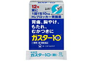 【お客様へ】第1類医薬品をご購入いただく前に、下記の注意事項をお読みください ガスター10 薬効分類 ヒスタミンH2受容体拮抗剤含有薬 製品名 ガスター10 製品の特徴 「ガスター10」は,胃の症状の原因となる胃酸の出過ぎをコントロールし,胃粘膜の修復を早める薬で,胃酸中和型の胃腸薬とは異なるタイプの胃腸薬です。 使用上の注意 ・3日間服用しても症状の改善がみられない場合は,服用を止めて,この文書を持って医師又は薬剤師に相談して下さい。・2週間を超えて続けて服用しないで下さい。 (重篤な消化器疾患を見過ごすおそれがありますので,医師の診療を受けて下さい) ■してはいけないこと(守らないと現在の症状が悪化したり,副作用が起こりやすくなります) 1.次の人は服用しないで下さい。 (1)ファモチジン等のH2ブロッカー薬によりアレルギー症状(例えば,発疹・発赤,かゆみ,のど・まぶた・口唇等のはれ)を起こしたことがある人 (2)医療機関で次の病気の治療や医薬品の投与を受けている人 血液の病気,腎臓・肝臓の病気,心臓の病気,胃・十二指腸の病気,ぜんそく・リウマチ等の免疫系の病気,ステロイド剤,抗生物質,抗がん剤,アゾール系抗真菌剤 (白血球減少,血小板減少等を起こすことがあります) (腎臓・肝臓の病気を持っている場合には,薬の排泄が遅れて作用が強くあらわれることがあります) (心筋梗塞・弁膜症・心筋症等の心臓の病気を持っている場合には,心電図異常を伴う脈のみだれがあらわれることがあります) (胃・十二指腸の病気の治療を受けている人は,ファモチジンや類似の薬が処方されている可能性が高いので,重複服用に気をつける必要があります) (アゾール系抗真菌剤の吸収が低下して効果が減弱します) (3)医師から赤血球数が少ない(貧血),血小板数が少ない(血が止まりにくい,血が出やすい),白血球数が少ない等の血液異常を指摘されたことがある人 (本剤が引き金となって再び血液異常を引き起こす可能性があります) (4)小児(15歳未満)及び高齢者(80歳以上) (5)妊婦又は妊娠していると思われる人2.本剤を服用している間は,次の医薬品を服用しないで下さい。 他の胃腸薬3.授乳中の人は本剤を服用しないか,本剤を服用する場合は授乳を避けて下さい。 ■相談すること 1.次の人は服用前に医師又は薬剤師に相談して下さい。 (1)医師の治療を受けている人又は他の医薬品を服用している人 (2)薬などによりアレルギー症状を起こしたことがある人 (3)高齢者(65歳以上) (一般に高齢者は,生理機能が低下していることがあります) (4)次の症状のある人 のどの痛み,咳及び高熱(これらの症状のある人は,重篤な感染症の疑いがあり,血球数減少等の血液異常が認められることがあります。服用前にこのような 症状があると,本剤の服用によって症状が増悪し,また,本剤の副作用に気づくのが遅れることがあります),原因不明の体重減少,持続性の腹痛(他の病気が 原因であることがあります)2.服用後,次の症状があらわれた場合は副作用の可能性がありますので,直ちに服用を中止し,この文書を持って医師又は薬剤師に相談して下さい。 [関係部位:症状]皮膚:発疹・発赤,かゆみ,はれ循環器:脈のみだれ精神神経系:気がとおくなる感じ,ひきつけ(けいれん)その他:気分が悪くなったり,だるくなったり,発熱してのどが痛いなど体調異常があらわれる。 まれに次の重篤な症状が起こることがあります。その場合は直ちに医師の診療を受けて下さい。 [症状の名称:症状]ショック(アナフィラキシー):服用後すぐに,皮膚のかゆみ,じんましん,声のかすれ,くしゃみ,のどのかゆみ,息苦しさ,動悸,意識の混濁等があらわれる。皮膚粘膜眼症候群(スティーブンス・ジョンソン症候群):高熱,目の充血,目やに,唇のただれ,のどの痛み,皮膚の広範囲の発疹・発赤等が持続したり,急激に悪化する。中毒性表皮壊死融解症:高熱,目の充血,目やに,唇のただれ,のどの痛み,皮膚の広範囲の発疹・発赤等が持続したり,急激に悪化する。横紋筋融解症:手足・肩・腰等の筋肉が痛む,手足がしびれる,力が入らない,こわばる,全身がだるい,赤褐色尿等があらわれる。肝機能障害:発熱,かゆみ,発疹,黄疸(皮膚や白目が黄色くなる),褐色尿,全身のだるさ,食欲不振等があらわれる。腎障害:発熱,発疹,全身のむくみ,全身のだるさ,関節痛(節々が痛む),下痢等があらわれる。血液障害:のどの痛み,発熱,全身のだるさ,顔やまぶたのうらが白っぽくなる,出血しやすくなる(歯茎の出血,鼻血等),青あざができる(押しても色が消えない)等があらわれる。間質性肺炎:階段を上ったり,少し無理をしたりすると息切れがする・息苦しくなる,空せき,発熱等がみられ,これらが急にあらわれたり,持続したりする。 3.誤って定められた用量を超えて服用してしまった場合は,直ちに服用を中止し,この文書を持って医師又は薬剤師に相談して下さい。4.服用後,次の症状があらわれることがありますので,このような症状の持続又は増強がみられた場合には,服用を中止し,この文書を持って医師又は薬剤師に相