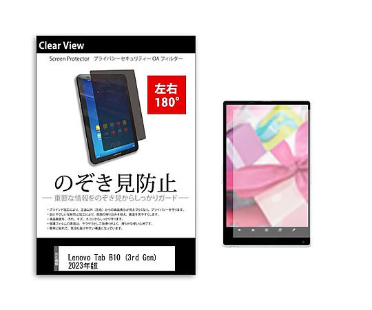 ●液晶画面の左右方向(180度)からの視線を遮り、プライバシーをしっかり保護します。●正面からはクリアな表示を確保。タブレットを縦向きに使用する場合は左右、横向きでは上下からの覗き見を防ぎます。●ブルーライトを効果的にカットし、目の疲れを軽減。長時間の作業にも適しています。●反射防止(アンチグレア)加工により、蛍光灯や日光の映り込みを抑え、画面を見やすく保ちます。●タッチパネル操作やペン入力にも対応しており、操作性を損ないません。●適合機種:Lenovo Tab B10 HD (2nd Gen) 2023年版●対応インチサイズ:10.1インチ 解像度(1280x800)●フィルム特性:のぞき見防止180度●紫外線カット率:99%●硬度:3H●内容量:1枚●付属品:クリーニングクロス、ヘラ●●ご購入前の注意点●▼本製品は液晶画面の表示領域のみをカバーする仕様です。ディスプレイ全体を覆うものではありません。●▼貼り付け時は液晶画面を強く押さえず、丁寧に作業してください。●▼貼付前にサイズの確認と位置合わせを行い、剥離フィルムは一度に全て剥がさず、少しずつ剥がして貼り付けてください。●▼ホコリや汚れが残っていると気泡の原因になりますので、必ず画面を清掃してからご使用ください。●記載された製品名やブランド名は、適合サイズの説明の便宜上使用しており、各社の商標または登録商標です。●当製品は互換品となります。公式メーカーが販売、製造するものではございません。純正品ではないことをご了承ください。●※※事業者向け商品です※※