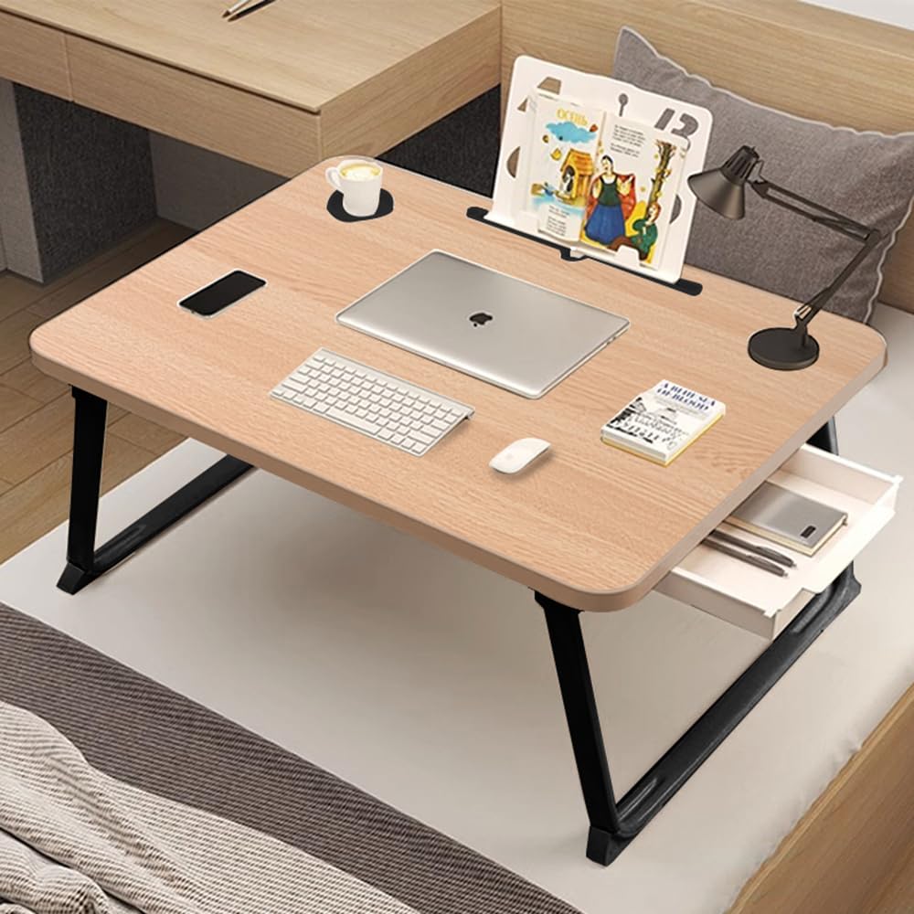 【送料無料】折りたたみテーブル 折り畳みテーブルパソコンデスク座卓 ベッドテーブル ローテーブル 凹溝付 き ラップトップテーブル ローテーブル PCデスク 大容量表面 多機能 軽量 色:オーク色 カードスロット + カップホルダー + 読書スタンド、サイズ:60*40*28cm