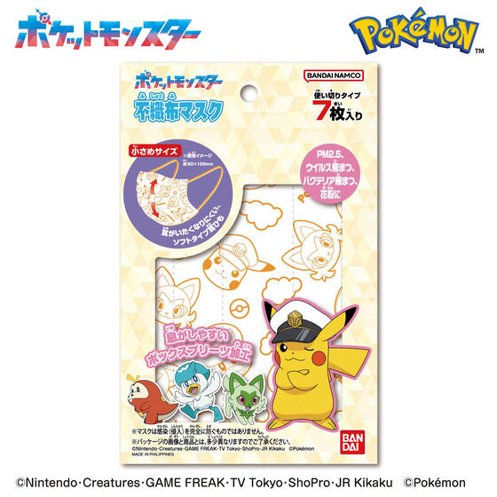 商品情報商品名こども用ポケットモンスター不織布マスク7枚入サイズ90mm×125mm入数7枚こども用 ポケットモンスター 不織布 マスク 7枚入り 日本マスク 公式 横井定 キャラクター 人気 定番 バンダイ ポケモン ピカチュウ *かぜの季節のお出かけに*チリやホコリが気になる場所で ピカチュウたちがプリントされた子ども用マスクが登場です。通気性の良い3層不織布マスク。立体型構造で呼吸はラクラク、会話もスムーズにできます。 5
