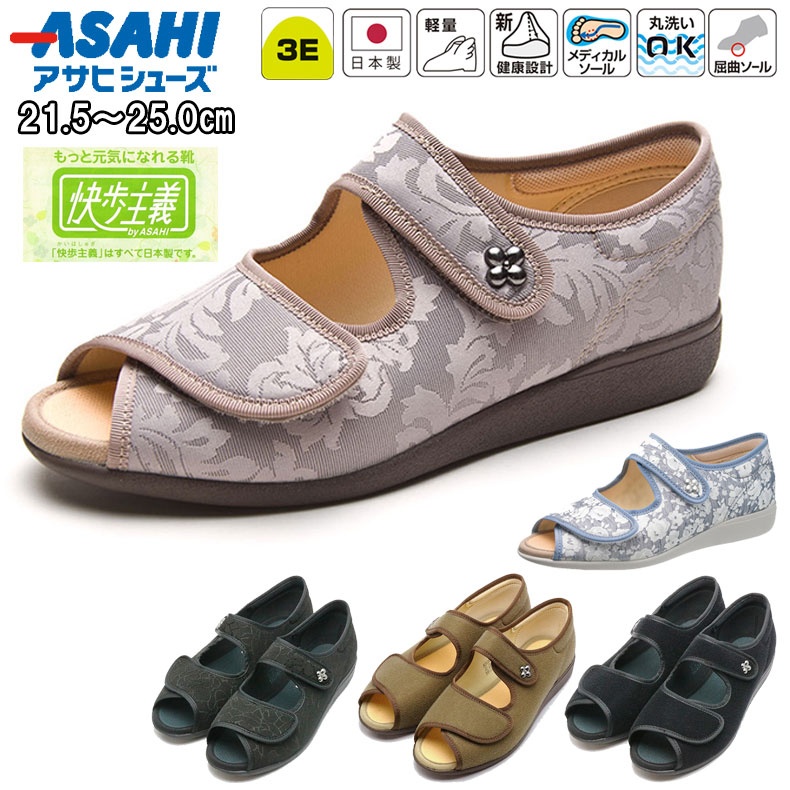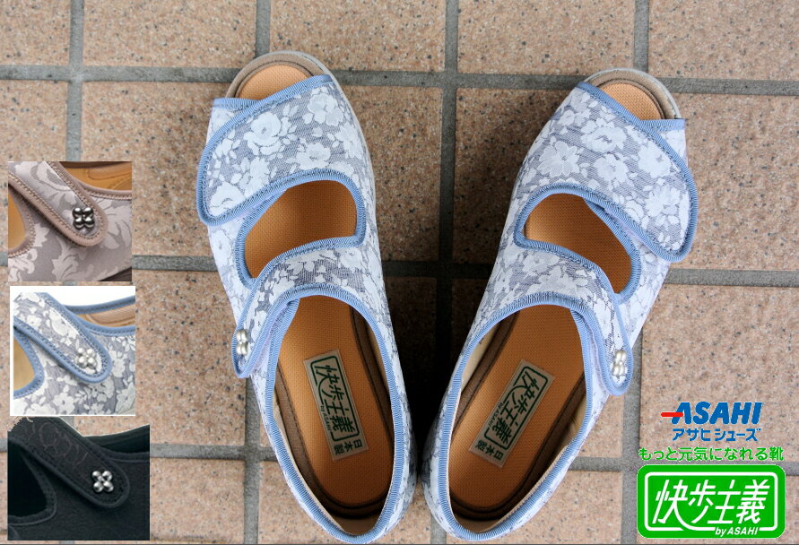 ギフト対応 *送付先リストを利用して同じ商品をいろいろなところへお届けします。>>>詳しくはこちらから この商品は足囲 3E です。 *サイズの確認をお願いします。 交換・返品について>> ●サイズ/21.5〜25.0cm(0.5cmきざみ)、3E ●材質/マテリアル:キャンバス・ポリエステル・ナイロン、ソール:ラバー ●生産国/日本 その他の快歩主義はこちらから>>> 高齢者向けシューズ一覧へ シニア ほめられ靴 快歩主義 女性用 人気/健康快適シューズ/アクティブシニア/【健康靴】【外出用】介護用、介助用、高齢者用、お年寄り、 年より、シニア用、ご年配用、介護靴、外履き用、介護シューズ、健康靴、リハビリシューズ、靴、くつ、 歩くのが楽、軽い、かかとが楽、ひざが楽、転倒しづらい、転倒しにくい、転ばない、安定感がる、バランス、 健康、散歩用、防水加工、すべらない、すべりにくい、滑り止め、通気性、匂い、臭い、におい、快適、 フィットする、長距離、長時間、立ち仕事、ワーク用、外仕事用、長く歩く、痩身、足腰を鍛える、メタボ、腰痛、 腰が痛い、つらい、偏平足、足腰が弱っている、おしゃれ、お洒落、オシャレ、人気、素敵、上品、高級、頑丈 、もちがいい、耐久性、街歩き、散歩、老人ホーム、介護施、サンダル/ムレない/室内履き/ おばあちゃん、おばちゃん、淑女、レディース、足元のオシャレ プレゼント ギフト クリスマス 母の日 父の日 誕生日 敬老の日 記念品 結婚記念日 メモリアルギフト お祝い 出産祝い 結婚祝い 御祝 引き出物 引出物 ウェディングギフト ブライダルギフト 景品 賞品 コンペ景品 ゴルフコンペ 粗品 お中元 御中元 お歳暮 御歳暮 残暑見舞い 贈答品 入学祝い 卒業祝い 成人式 就職祝い 昇進祝い 定年退職記念 還暦祝い 卒業記念品 内祝 お返し お礼 御礼 デイサービス 介護 特養 老人ホーム シニア 高齢者 おしゃれなシルバーカー 公園 ウォーキング 8050 6090 7040健康・快適シューズ市場シェアNo.1ブランド「快歩主義」 こころが弾む履き心地、お散歩やお出掛けに!! サンダルタイプでムレしらず! ・3つの快適設計。この履きやすさ、歩きやすさをあなたも体感してください。 ・「快歩主義」は全て日本製です。 ・水に浮くほど軽い!靴底に、超軽量のエクスパンセル配合ラバーを使い、足の負担を軽減しました。(※完全防水ではありません。) ・つまずきにくく安心!つま先を20mm、踵を12mm巻上げつまずきを防止。着地や蹴り出しがスムーズに行えます。 ・脱ぎ履きカンタン!靴の上部には大きく開くマジックテープを使い、脱ぐことも履くこともカンタンです。 ・理想的な歩行をサポートするアサヒ独自の機能「フットオンコントローラーシステム」。 ・二本のマジックテープを使ったサンダルタイプで夏場も快適歩行。