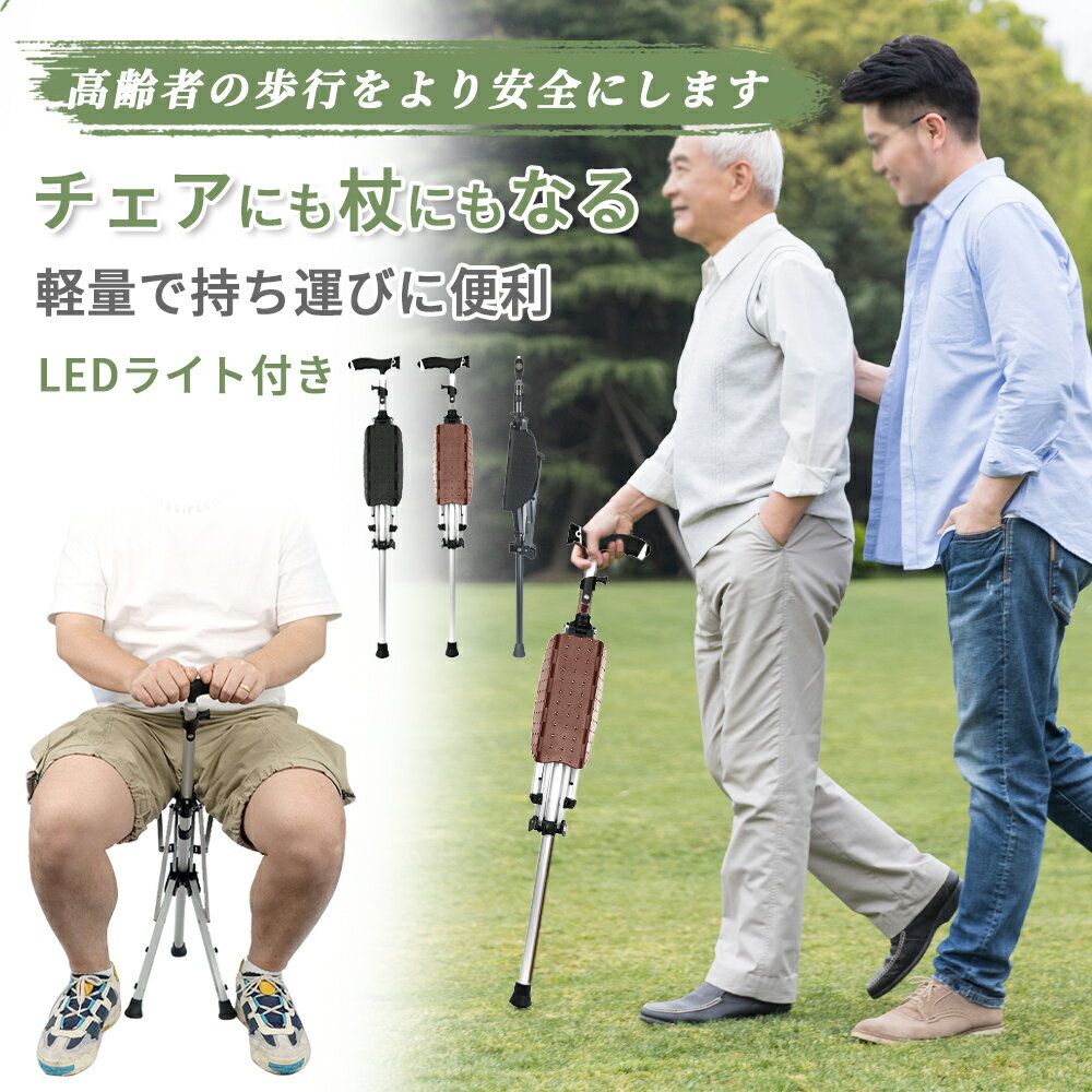 【年末12%OFFクーポン】ステッキチェア ワンタッチ 折りたたみ椅子付きステッキ 軽量 LEDライト付き 滑り止め加工 安心設計 高齢者向け多機能杖 散歩 介護用品 歩行支援 杖 座れる 2in1 散歩 旅行 アウトドア スポーツ観戦 行楽 チェア