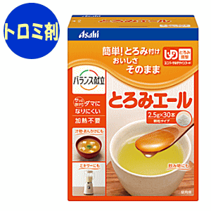 介護用トロミ材、とろみ調整 商品名:とろみエール 2.5g×30本入 ・味を変えずにすぐ溶ける ・ダマになりにくいので便利です。 ・臭いや苦味、エグ味も無く、透明性も高いので 食品のおいしさもそのまま。 ・ユニバーサルデザイン ・原材料:デキストリン 増粘多糖類、クエン酸Na、乳酸Ca ・エネルギー:7キロカロリー(2.5g当たり) ・内容量:2.5g×30本 ・メーカー:アサヒグループ食品