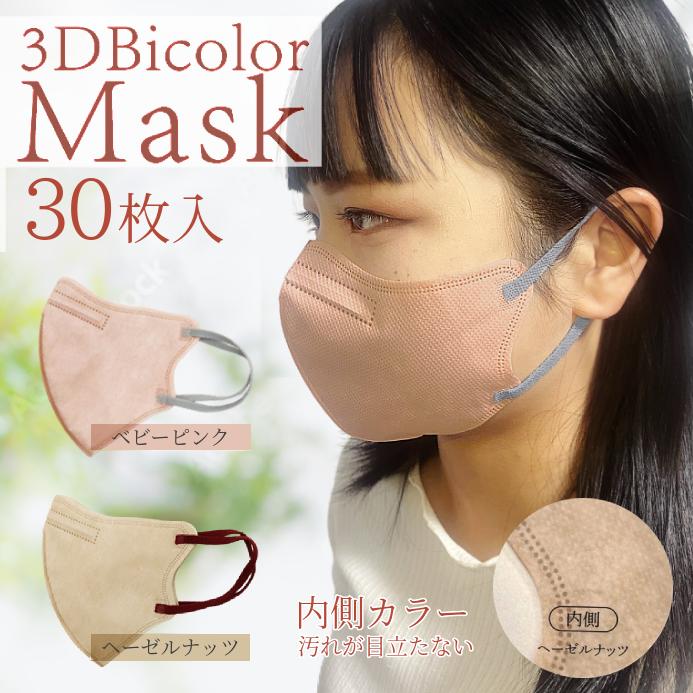 3D バイカラー マスク 30枚入 個包装 不織布 口元空間 立体構造 3層構造 両面 平ゴム ノーズ フィット ワイヤー ヘーゼルナッツ ベビーピンク 裏側カラー ベージュ系 ヒロコーポレーション バイカラー バイ マスク