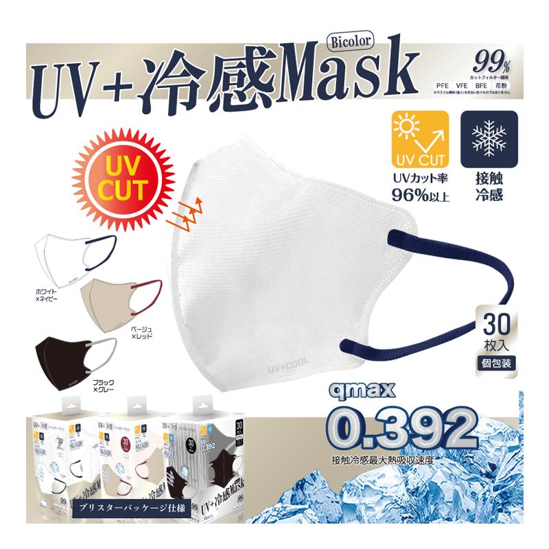 UV+冷感バイカラーマスク 30枚入 3D UVカット 個包装 不織布 口元空間 立体構造 3層構造 両面 平ゴム ノーズ フィット ワイヤー ホワイト×ネイビー グレー×ブラック 裏側白 ヒロコーポレーション バイカラー UVカット率96%以上 接触冷感 冷感