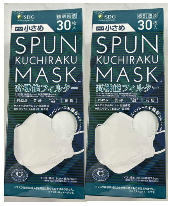 【30枚入×2箱セット送料込】医食同源ドットコム SPUN KUCHIRAKU MASK スパンレース 不織布マスク 小さめ ホワイト 個別包装 小さめサイズマスク 光沢感 立体 スパンレース不織布 ノーズV字カットの女性やお子様でも使いやすい小さめサイズ! ( 4562355182009 )