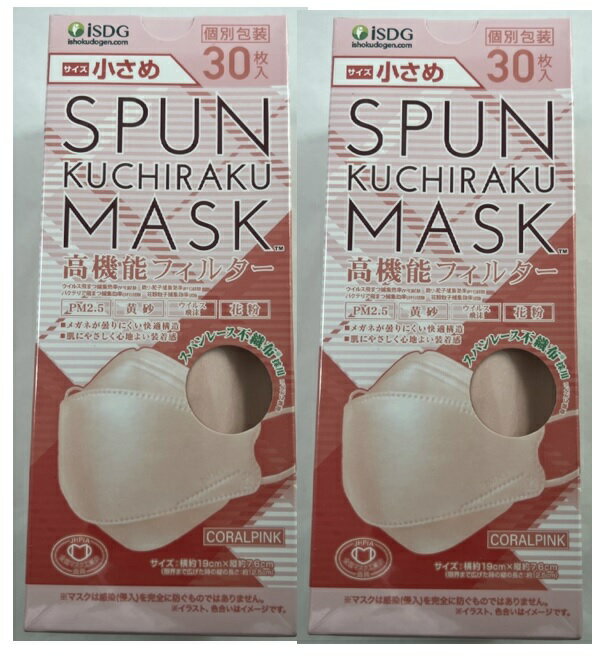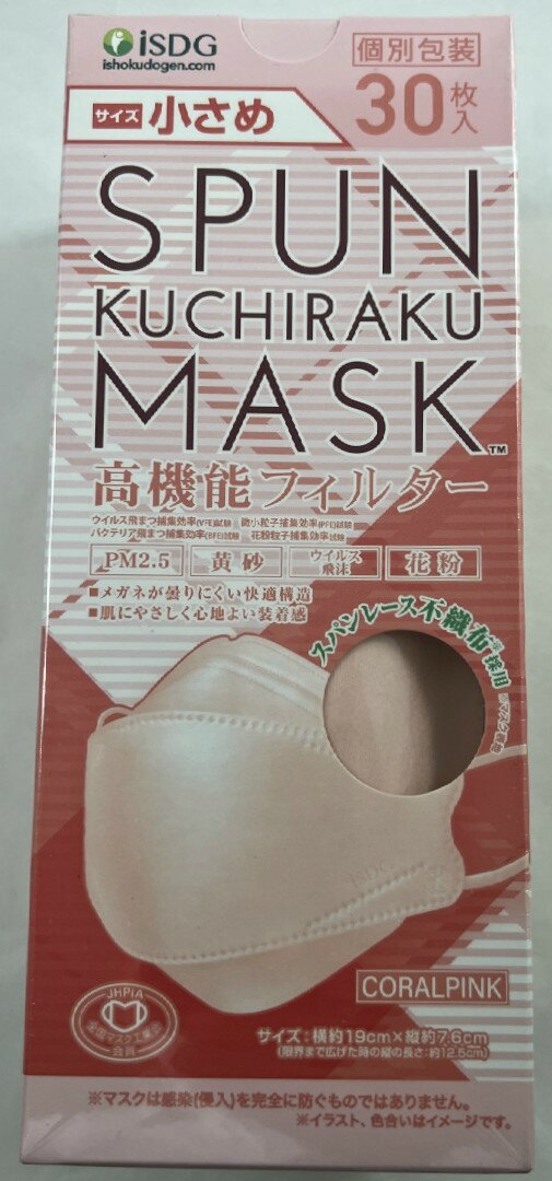 【30枚入×2箱セット送料込】医食同源ドットコム SPUN KUCHIRAKU MASK スパンレース 不織布マスク 小さめ コーラルピンク 個別包装 小さめサイズマスク 光沢感 立体 スパンレース不織布 ノーズV字カットの女性やお子様でも使いやすい小さめサイズ! (4562355182023 )