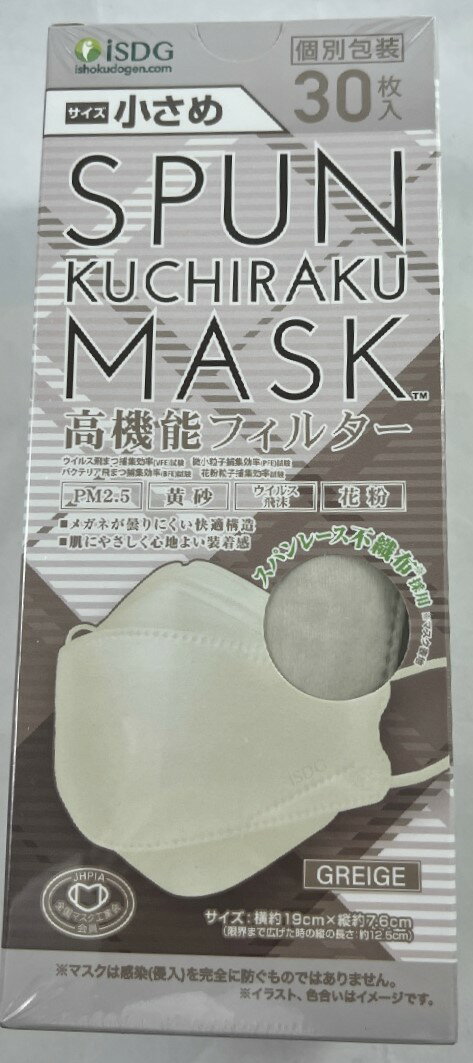 医食同源ドットコム SPUN KUCHIRAKU MASK スパンレース 不織布マスク 小さめ グレージュ 30枚入 個別包装 小さめサイズマスク 光沢感 立体 スパンレース不織布 ノーズV字カットの女性やお子様でも使いやすい小さめサイズ! (4562355182030 )