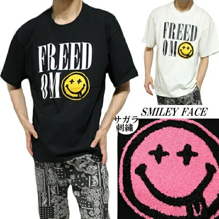 スマイリー フェイス Tシャツ サガラ刺繍 ニコちゃんマーク ニコニコマーク スマイルマーク 服 グッズ メンズ SMILEY FACE ワイドサイズ カットソー 半袖 通販 ブラック/ホワイト/ピンク M-XL