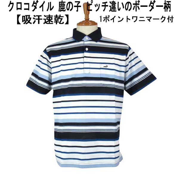 夏 クロコダイル 半袖 ポロシャツ 綿ポリエステル 鹿の子素材 1ポイントクロコダイルマーク付 ピッチ違いボーダー柄 白ベース/紺ブルー濃淡【M】【L】